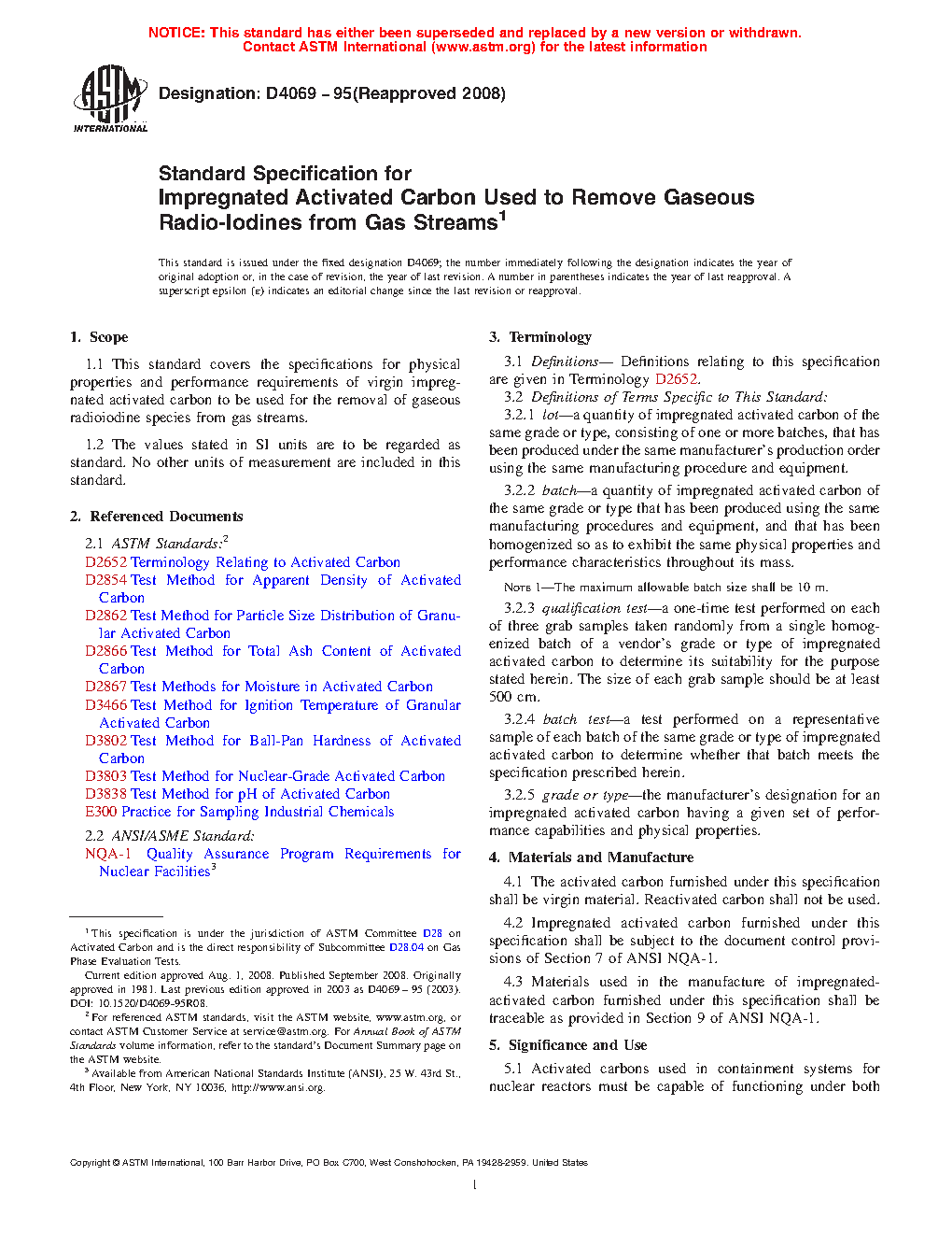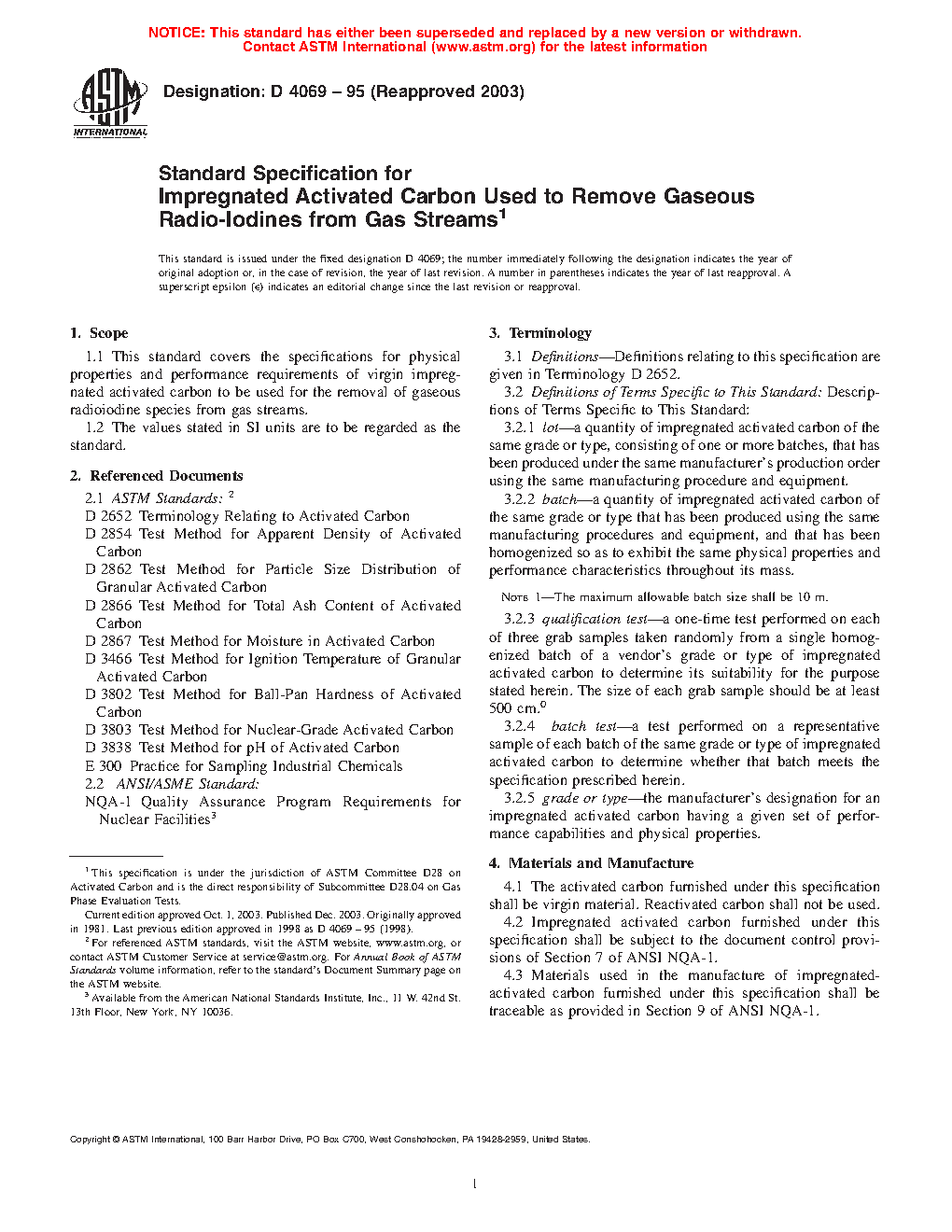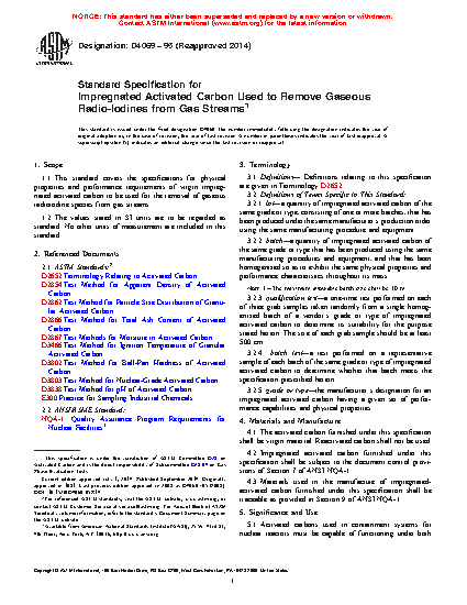 1.1 This standard covers the specifications for physical properties and performance requirements of virgin impregnated activated carbon to be used for the removal of gaseous radioiodine species from gas streams.