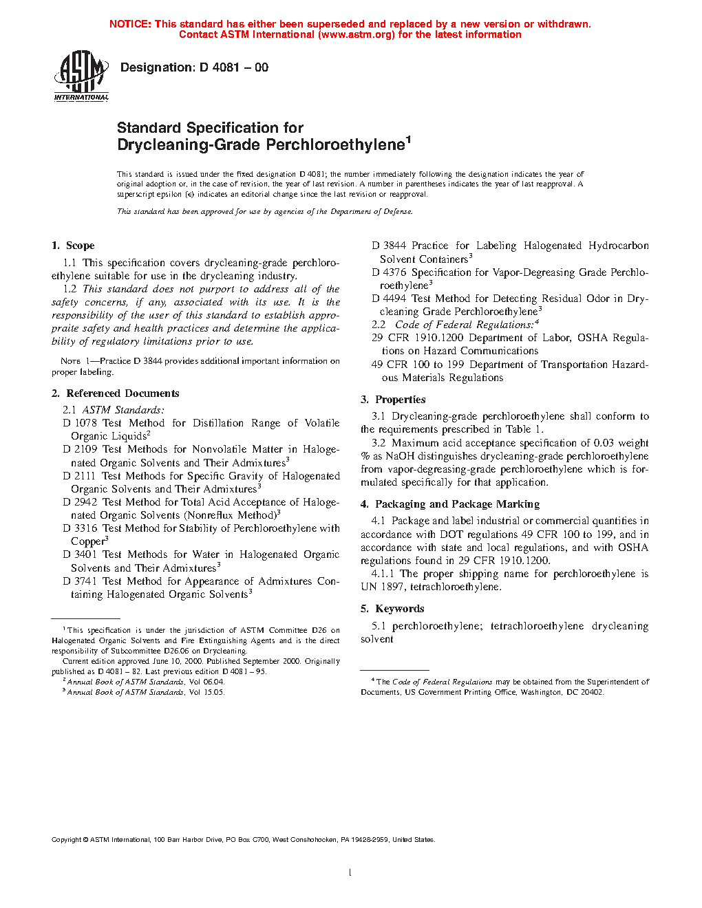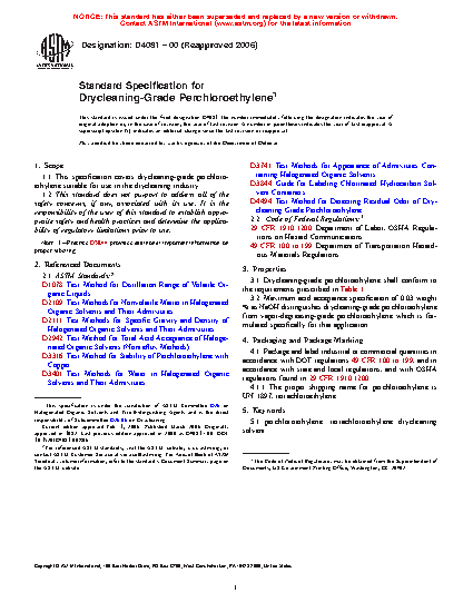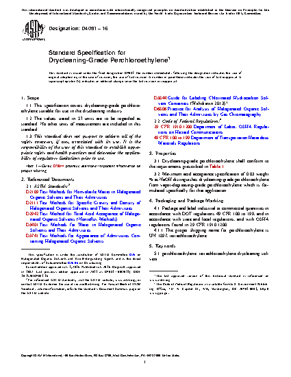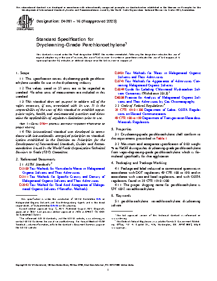 This specification covers dry cleaning-grade perchloroethylene suitable for use in the dry cleaning industry. Materials shall be tested and the individual grades shall conform to specified values of appearance, water content, residual odor, specific gravity, non-volatile residue content, boiling point, dry point, acid acceptance, and copper corrosion.