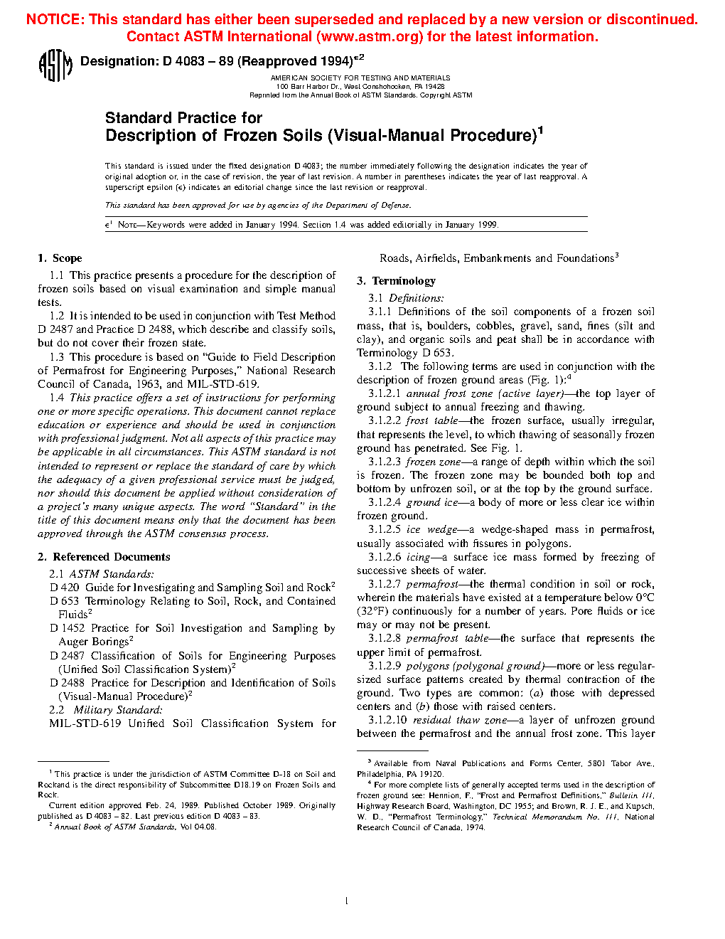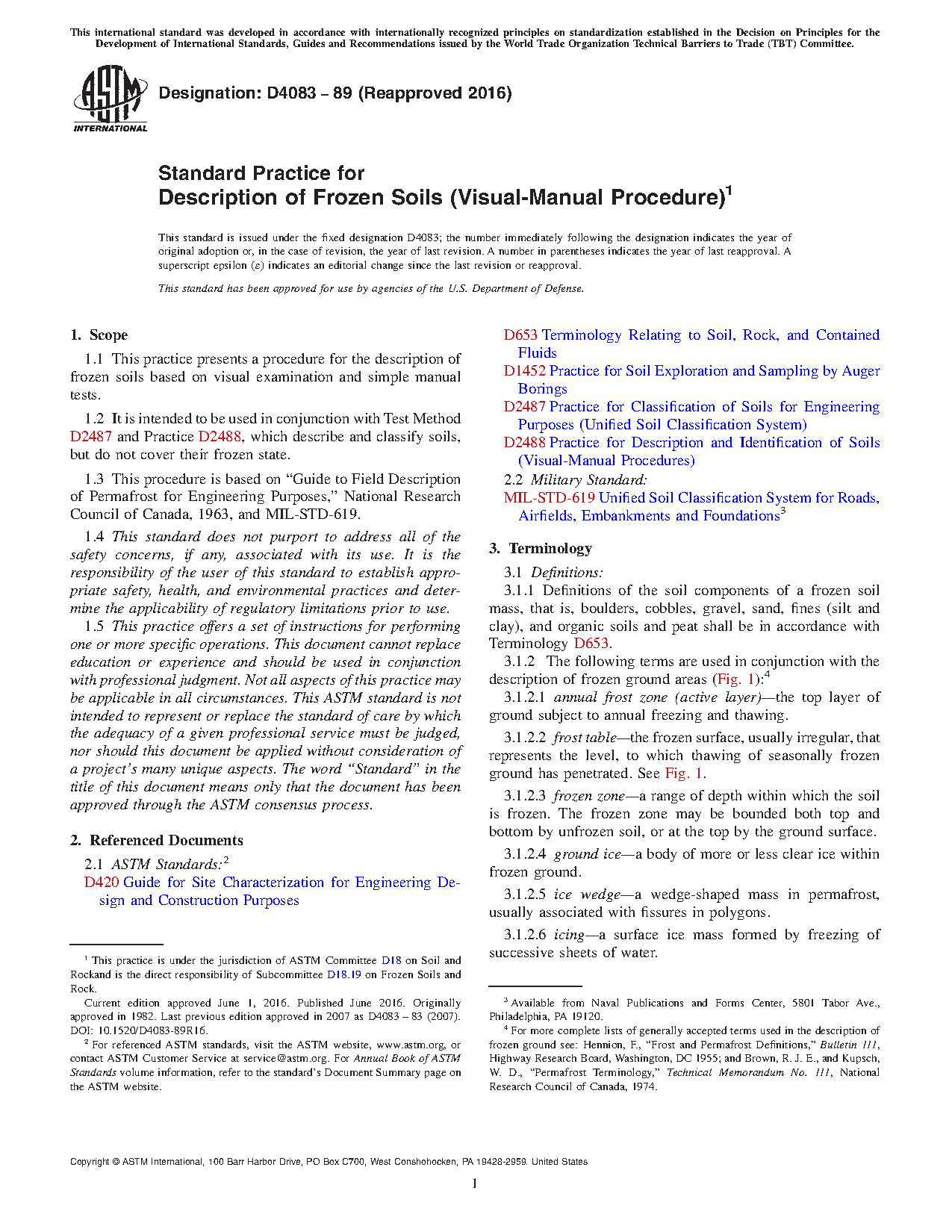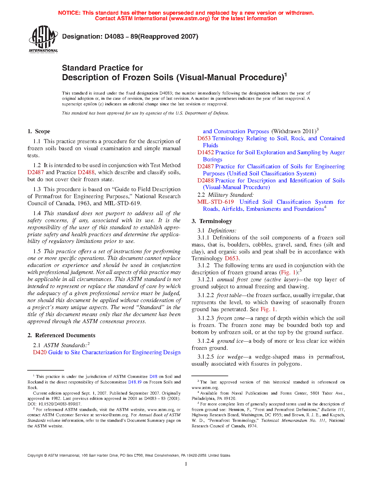 1.3 This procedure is based on "Guide to Field Description of Permafrost for Engineering Purposes," National Research Council of Canada, 1963, and MIL-STD-619.