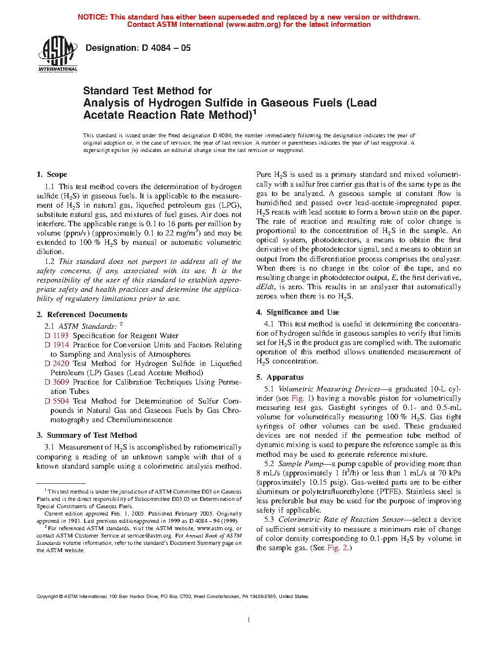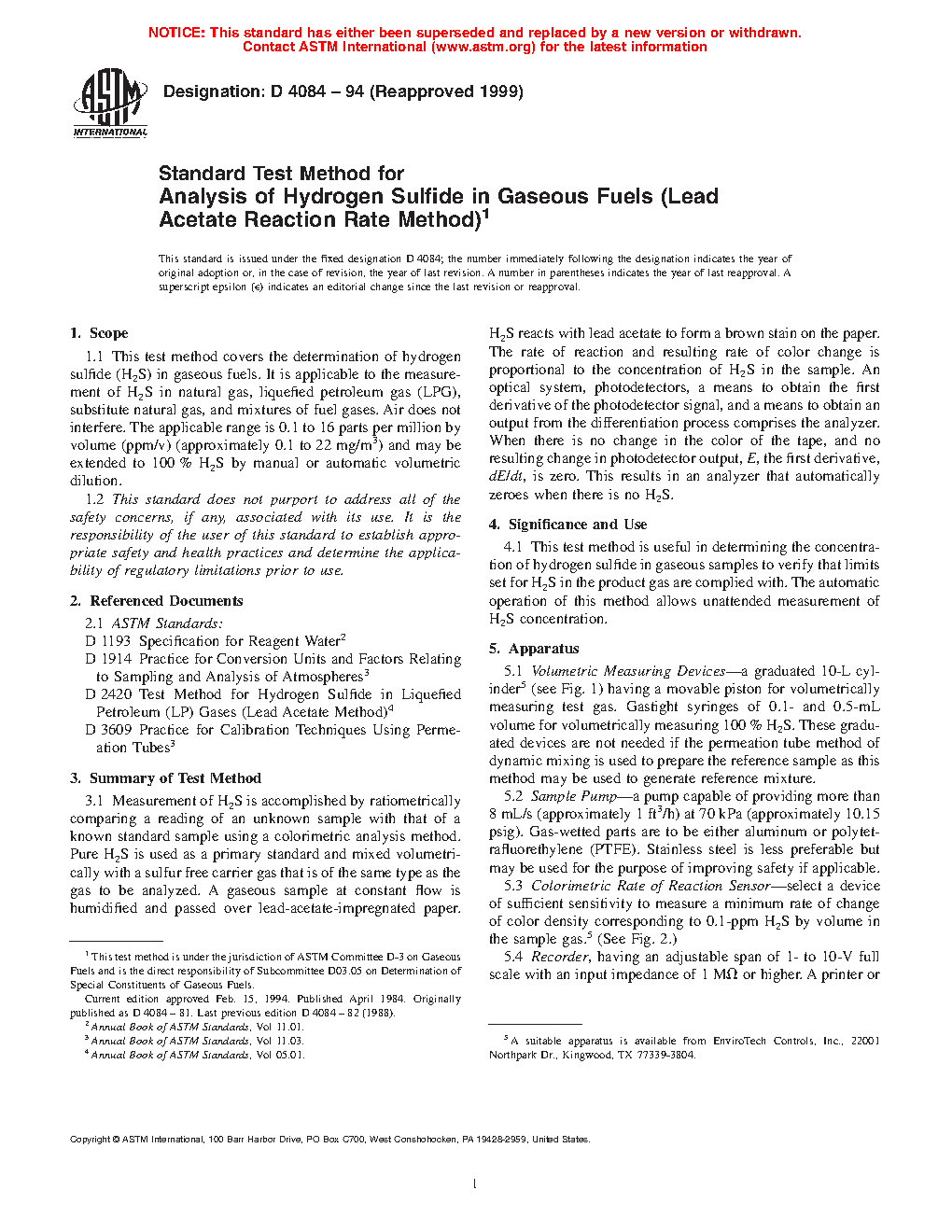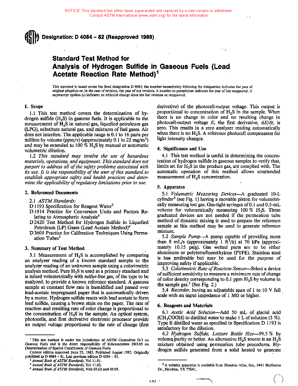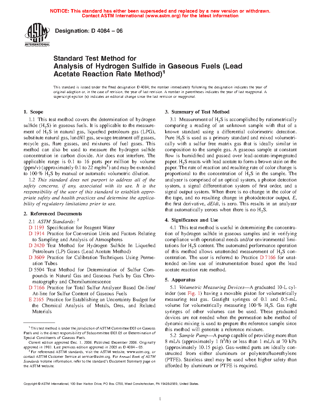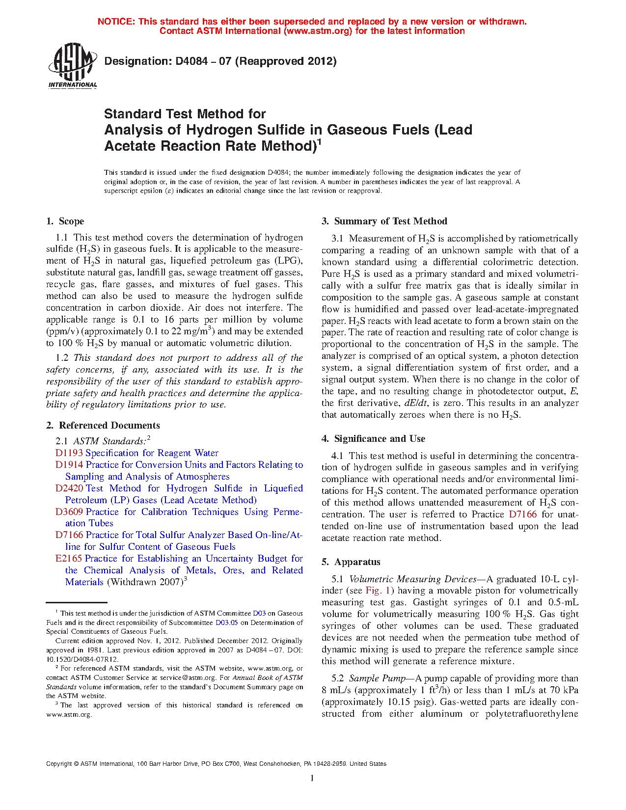 1.1 This test method covers the determination of hydrogen sulfide (H 2 S) in gaseous fuels. It is applicable to the measurement of H 2 S in natural gas, liquefied petroleum gas (LPG), substitute natural gas, and mixtures of fuel gases. Air does not interfere. The applicable range is 0.1 to 16 parts per million by volume (ppm/v) (approximately 0.1 to 22 mg/m ) and may be extended to 100% H 2 S by manual or automatic volumetric dilution.