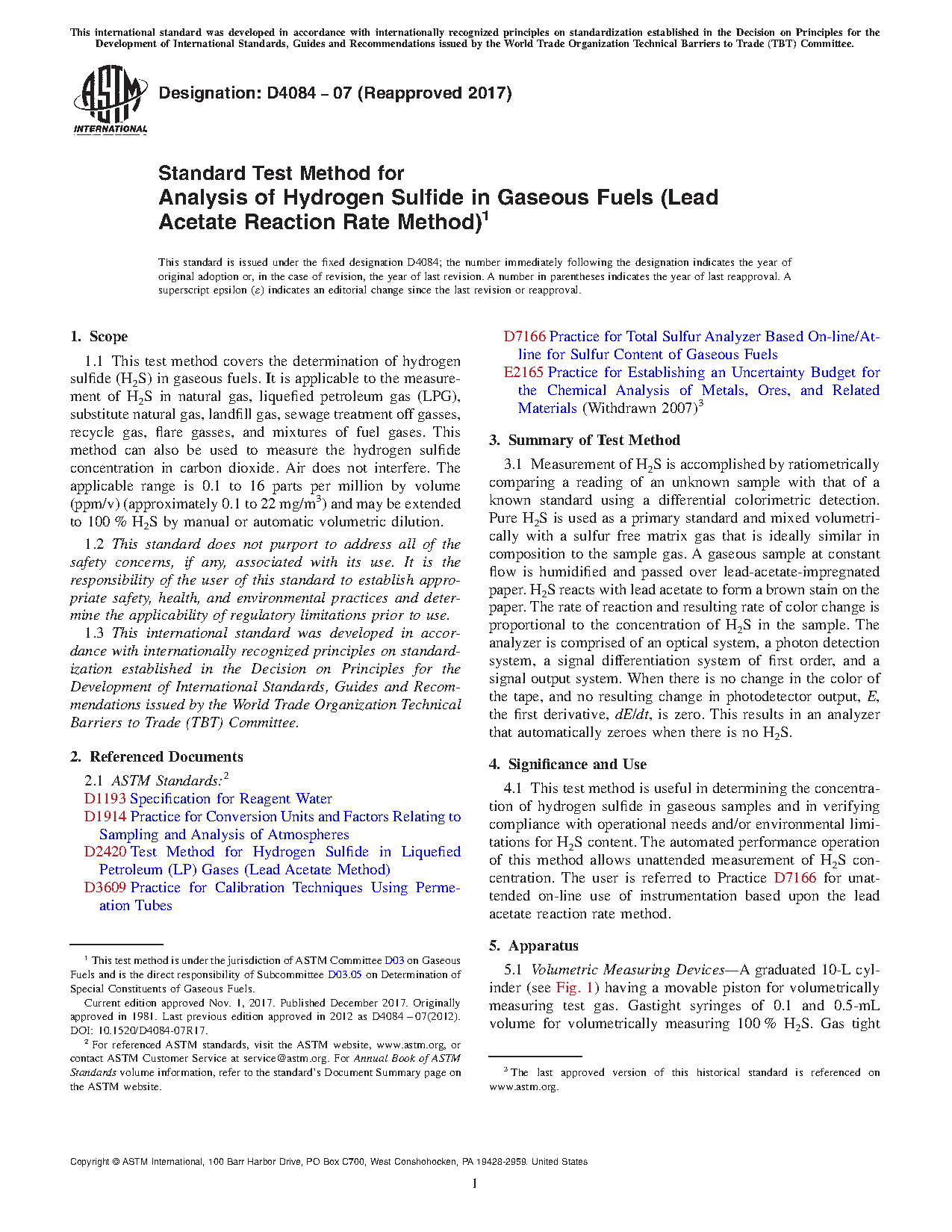 Standard Test Method for Analysis of Hydrogen Sulfide in Gaseous Fuels (Lead Acetate Reaction Rate Method)