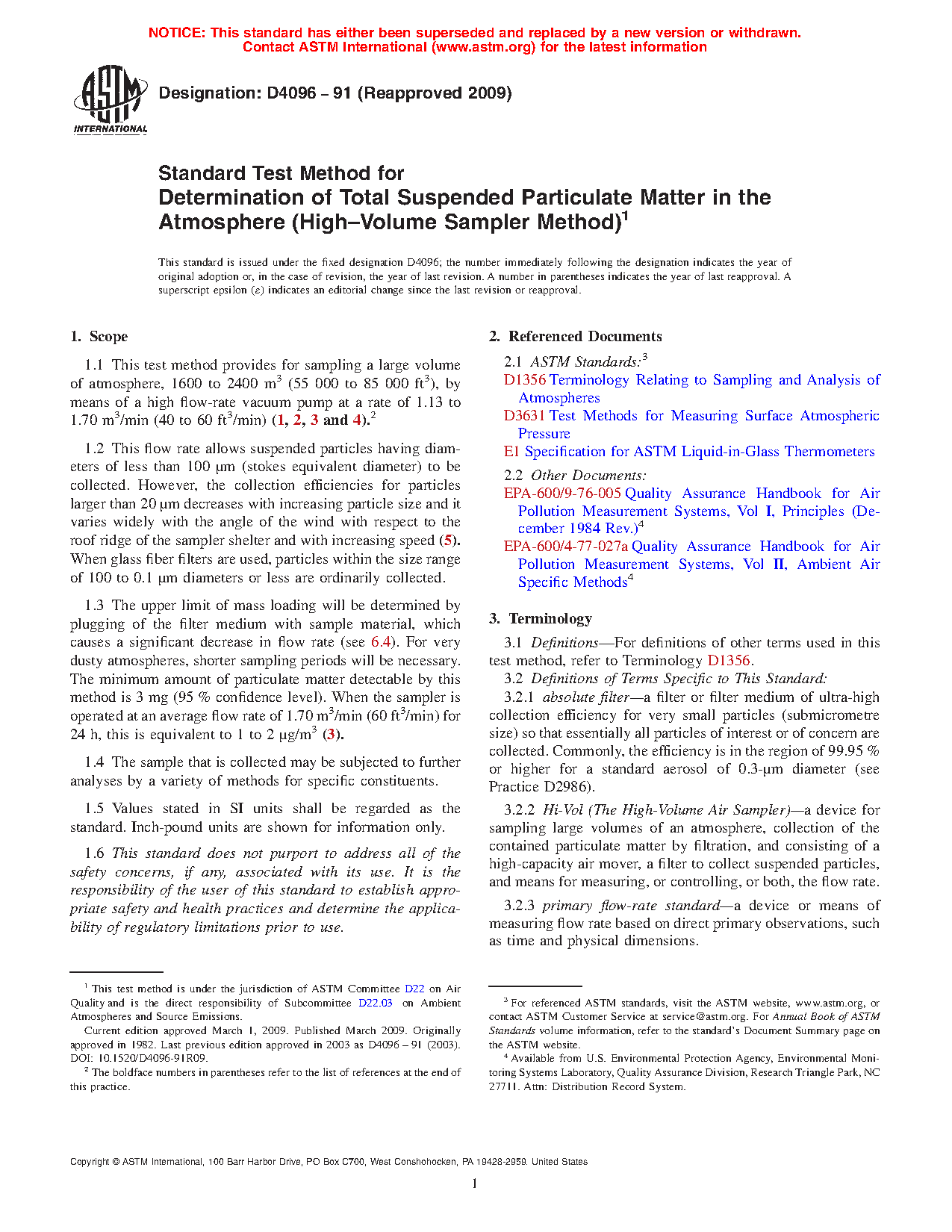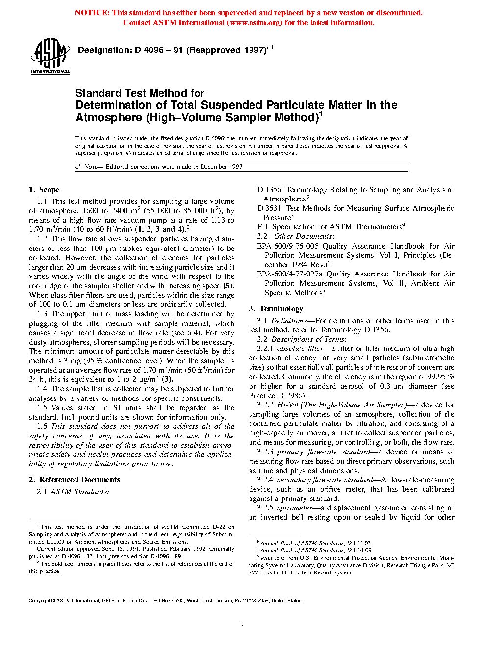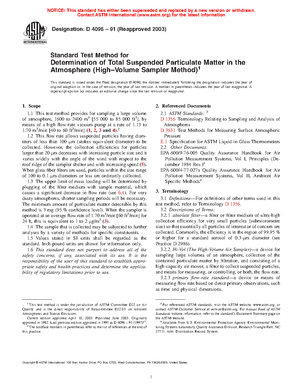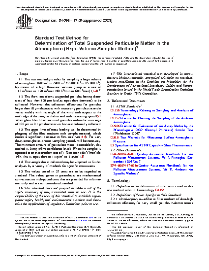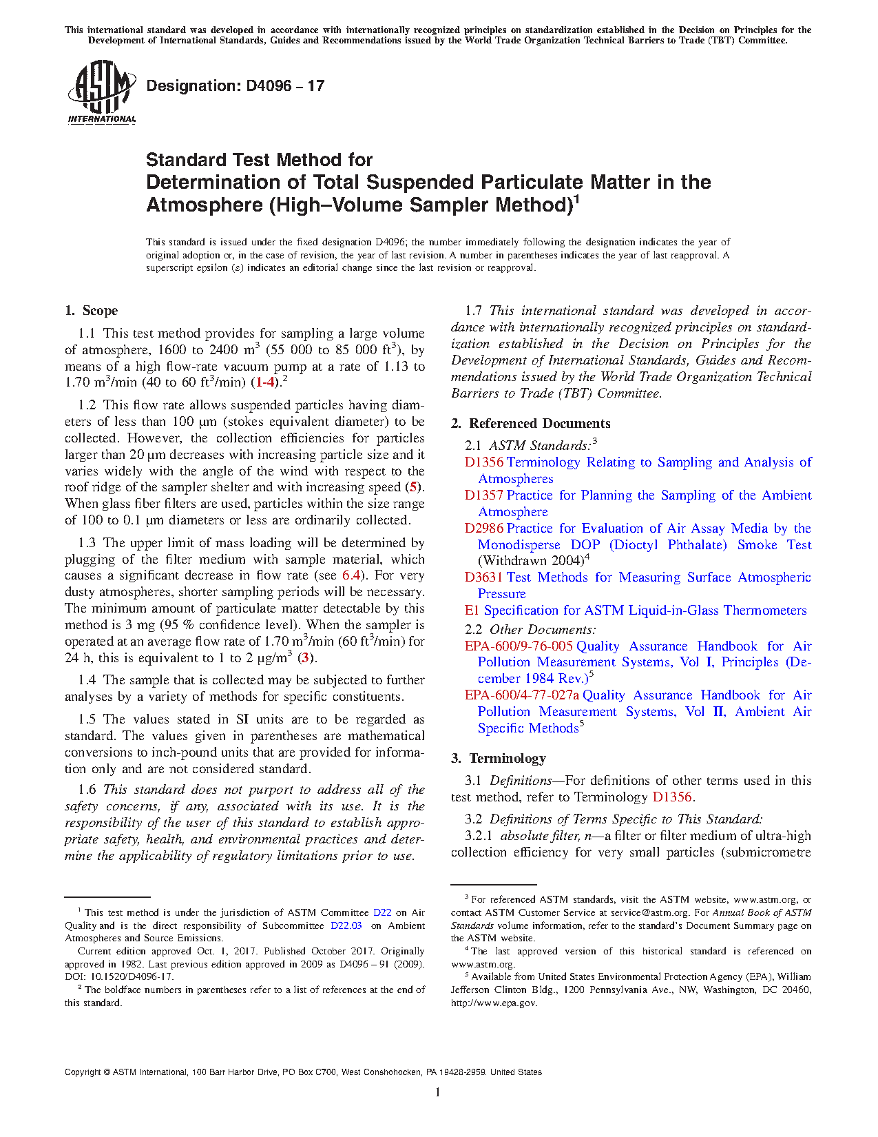 1.1 This test method provides for sampling a large volume of atmosphere, 1600 m3 to 2400 m3 (55 000 ft3 to 85 000 ft3), by means of a high flow-rate vacuum pump at a rate of 1.13 m3/min to 1.70 m3/min (40 ft3/min to 60 ft3/min) (1-4).2