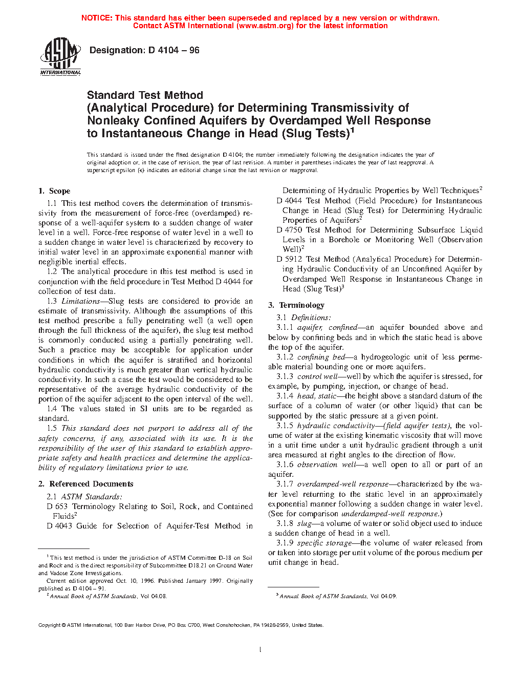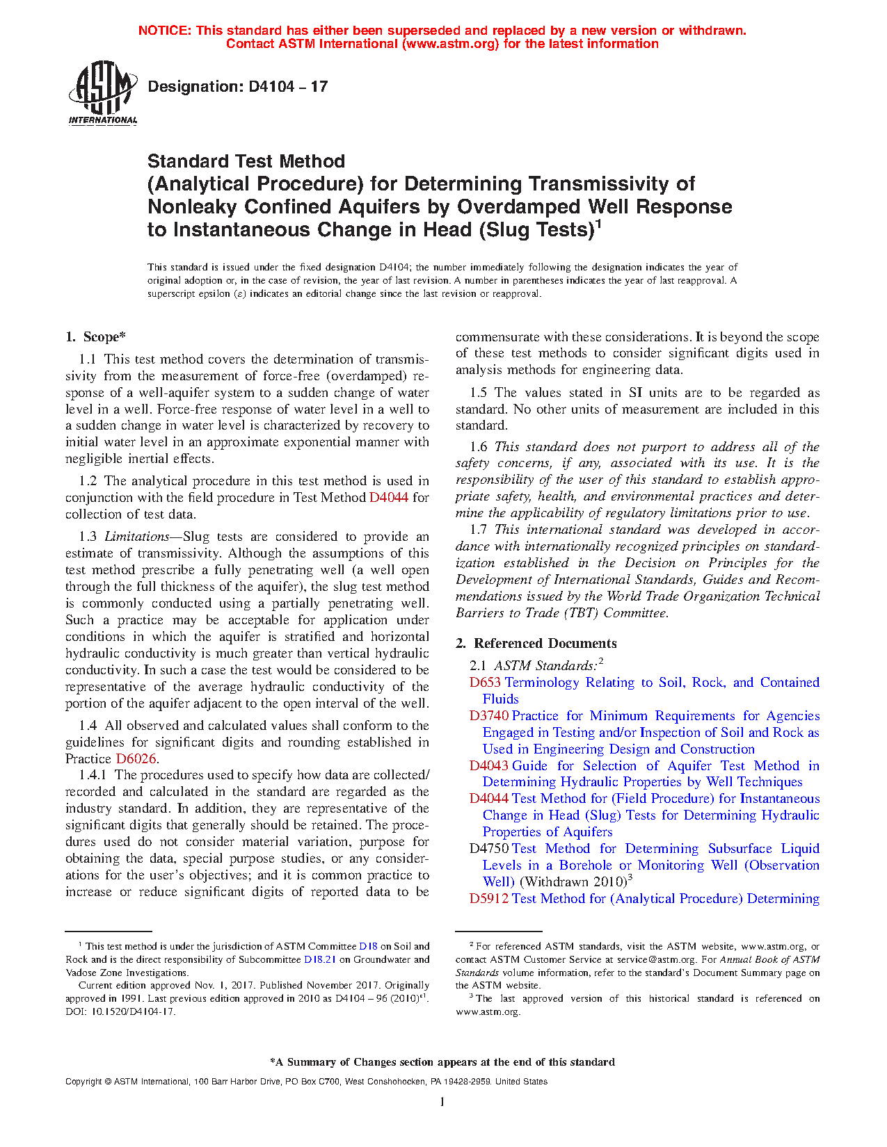 1.1 This test method covers the determination of transmissivity from the measurement of force-free (overdamped) response of a well-aquifer system to a sudden change of water level in a well. Force-free response of water level in a well to a sudden change in water level is characterized by recovery to initial water level in an approximate exponential manner with negligible inertial effects.