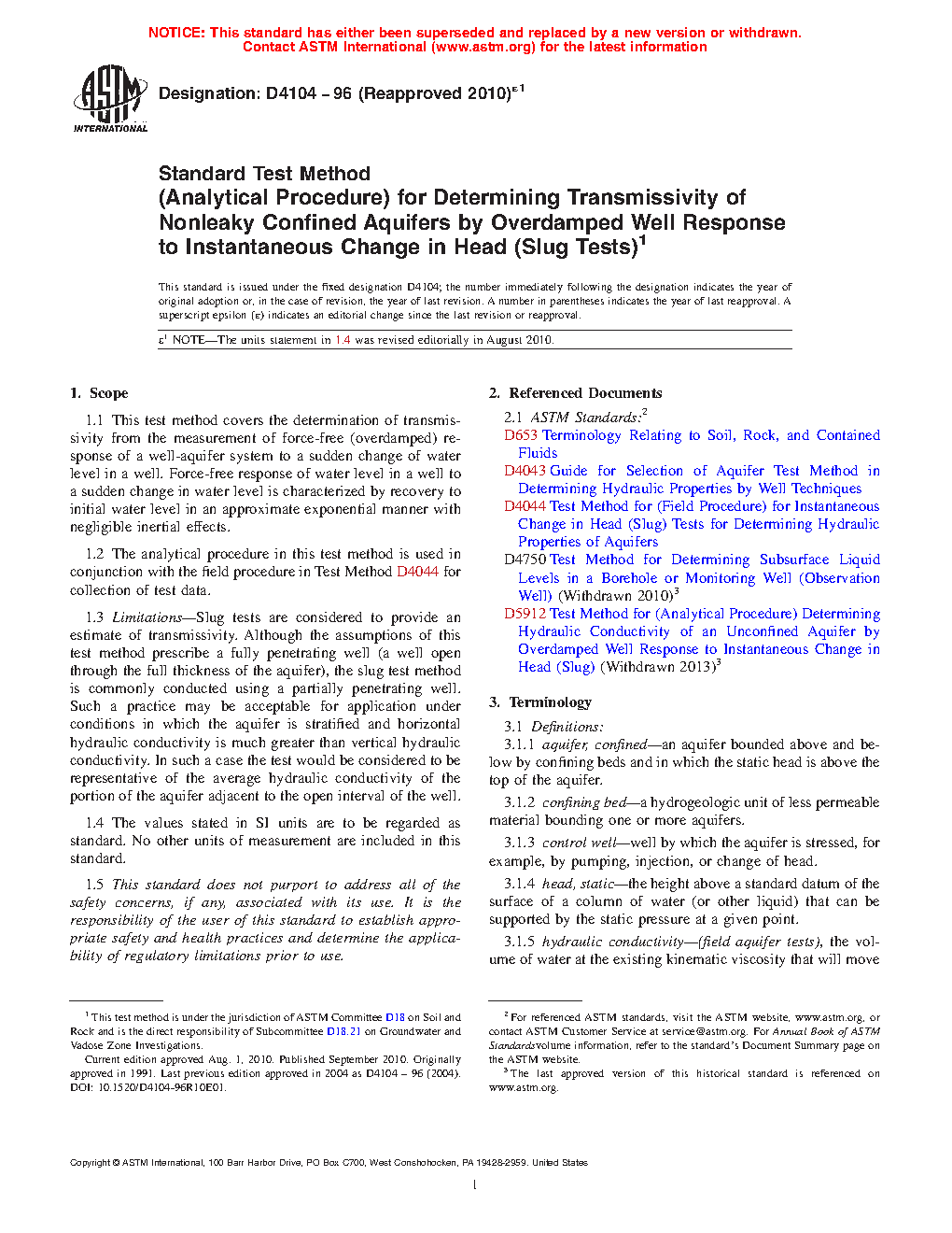 1.3 Limitations—Slug tests are considered to provide an estimate of transmissivity. Although the assumptions of this test method prescribe a fully penetrating well (a well open through the full thickness of the aquifer), the slug test method is commonly conducted using a partially penetrating well. Such a practice may be acceptable for application under conditions in which the aquifer is stratified and horizontal hydraulic conductivity is much greater than vertical hydraulic conductivity. In such a case the test would be considered to be representative of the average hydraulic conductivity of the portion of the aquifer adjacent to the open interval of the well.