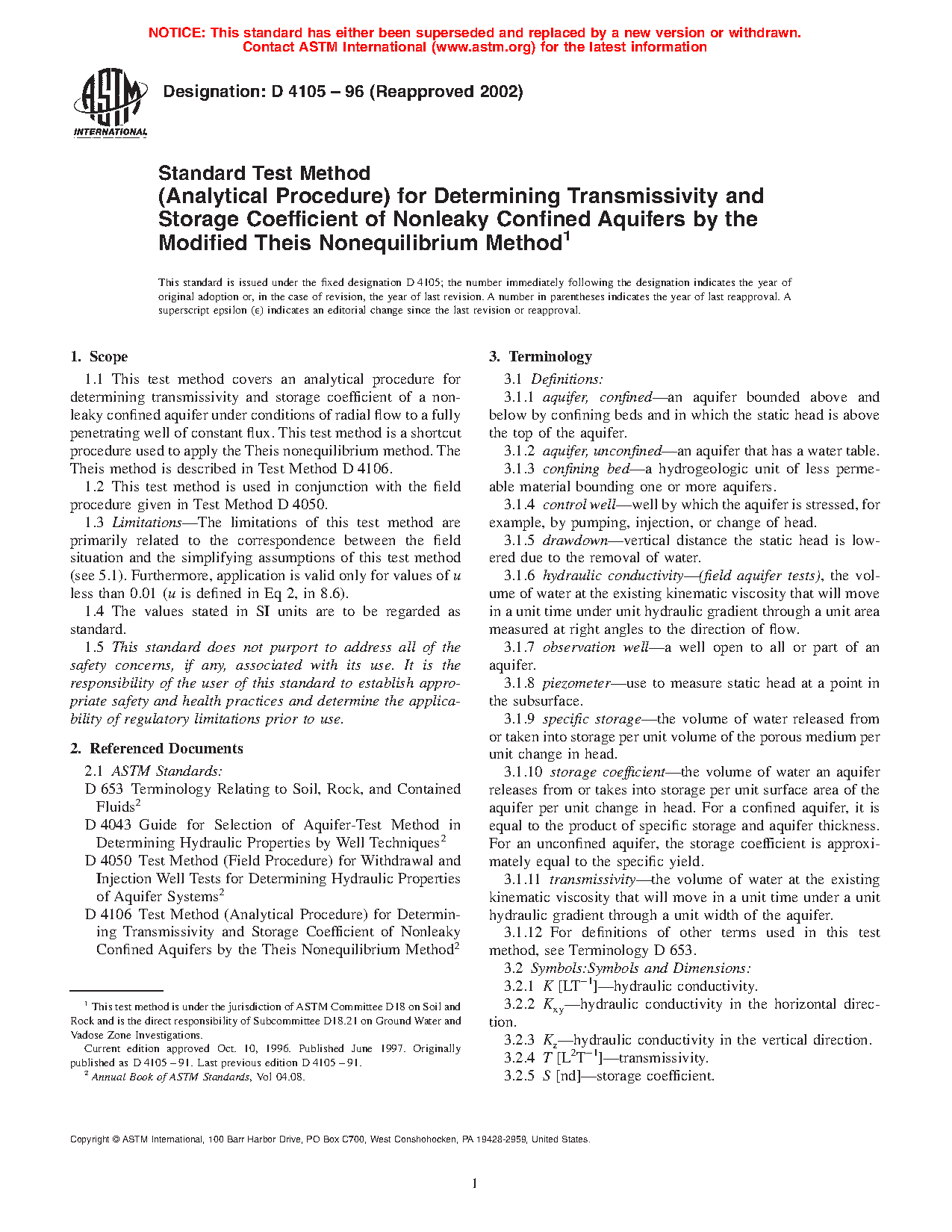1.1 This test method covers an analytical procedure for determining transmissivity and storage coefficient of a nonleaky confined aquifer under conditions of radial flow to a fully penetrating well of constant flux. This test method is a shortcut procedure used to apply the Theis nonequilibrium method. The Theis method is described in Test Method D4106.