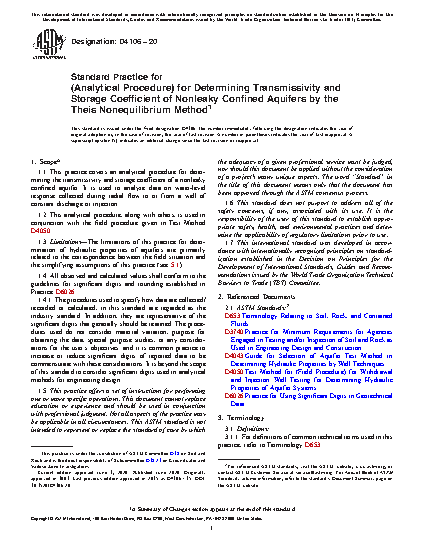 1.1 This practice covers an analytical procedure for determining the transmissivity and storage coefficient of a nonleaky confined aquifer. It is used to analyze data on water-level response collected during radial flow to or from a well of constant discharge or injection.