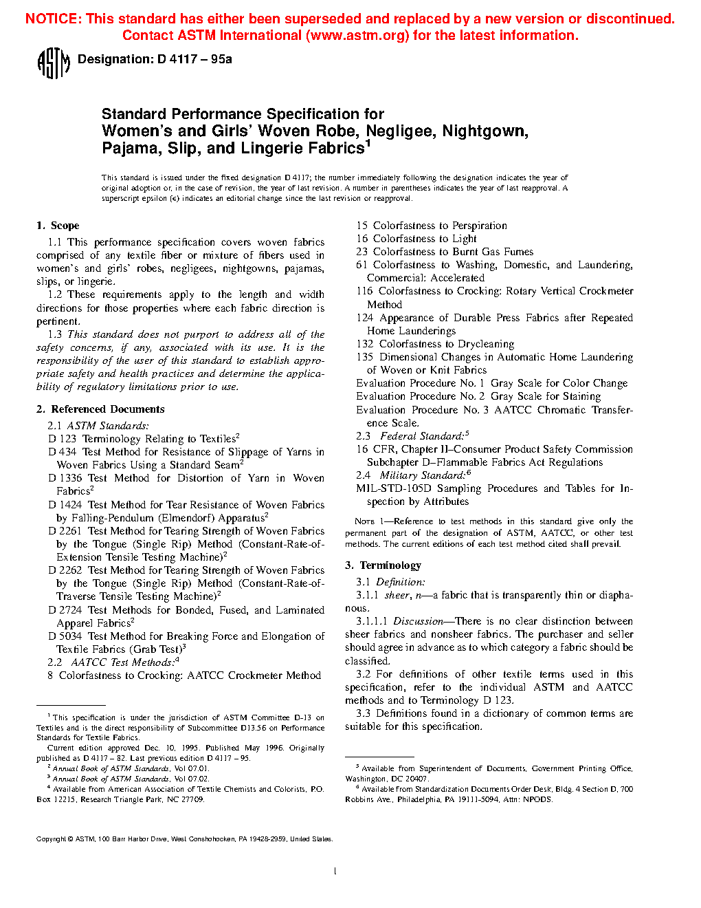 1.1 This performance specification covers woven fabrics comprised of any textile fiber or mixture of fibers used in women's and girls' robes, negligees, nightgowns, pajamas, slips, or lingerie.