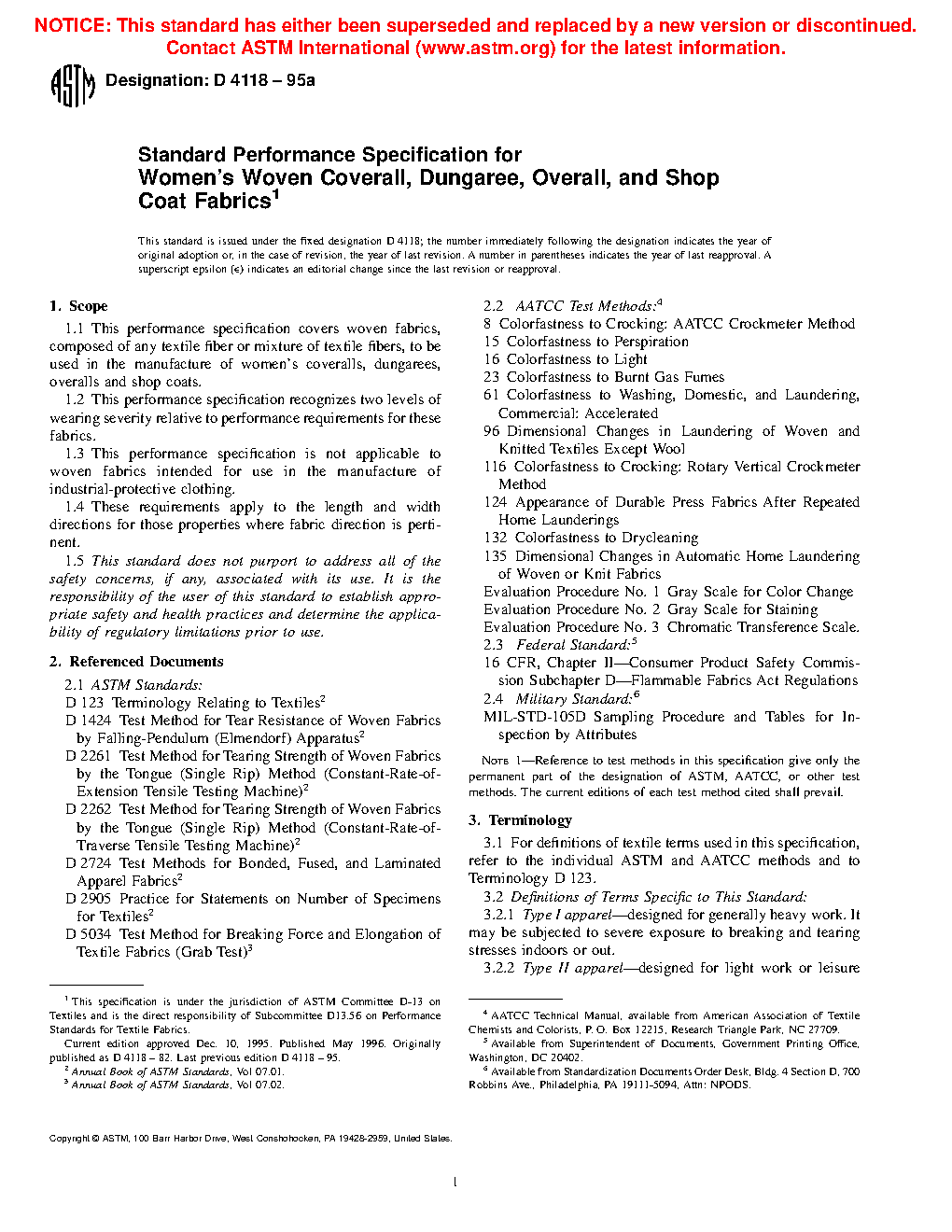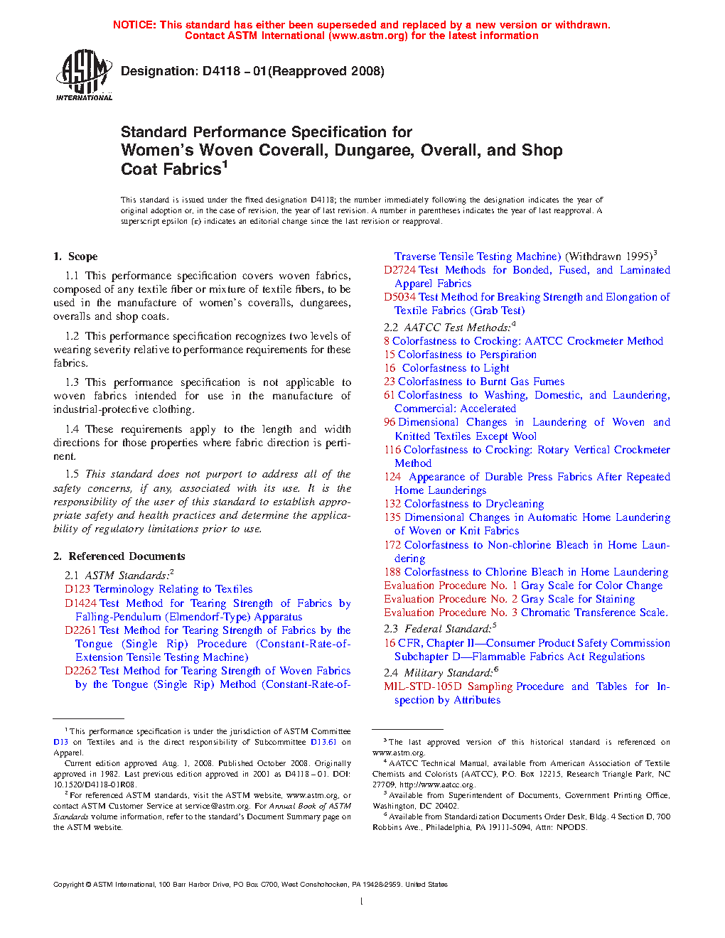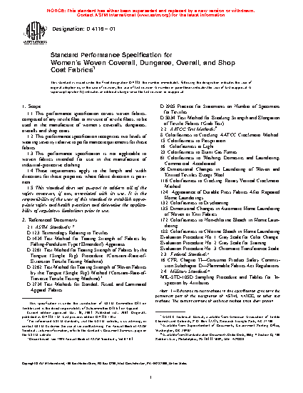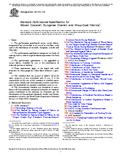 1.1 This performance specification covers woven fabrics, composed of any textile fiber or mixture of textile fibers, to be used in the manufacture of coveralls, dungarees, overalls and shop coats.