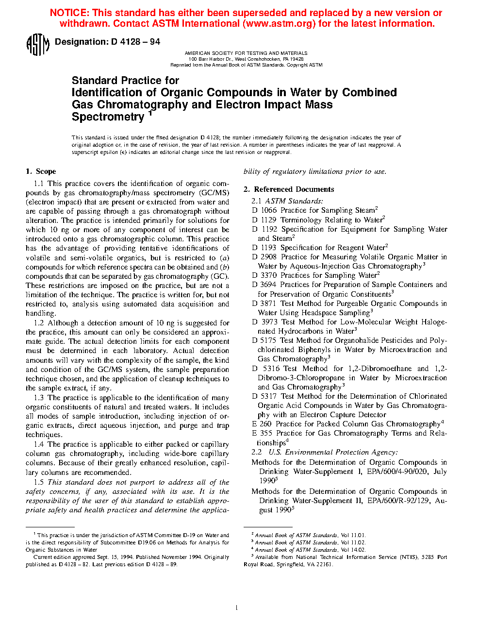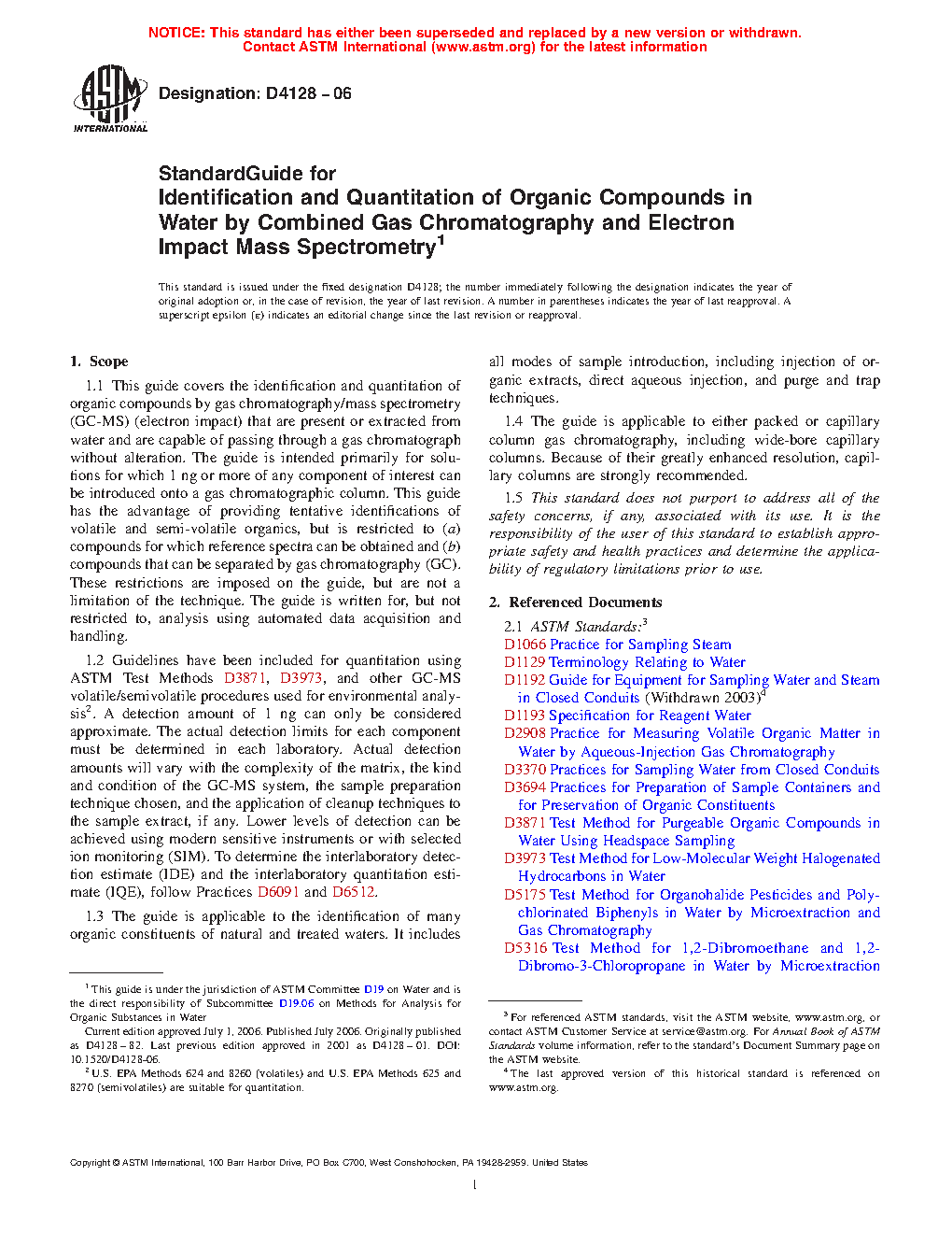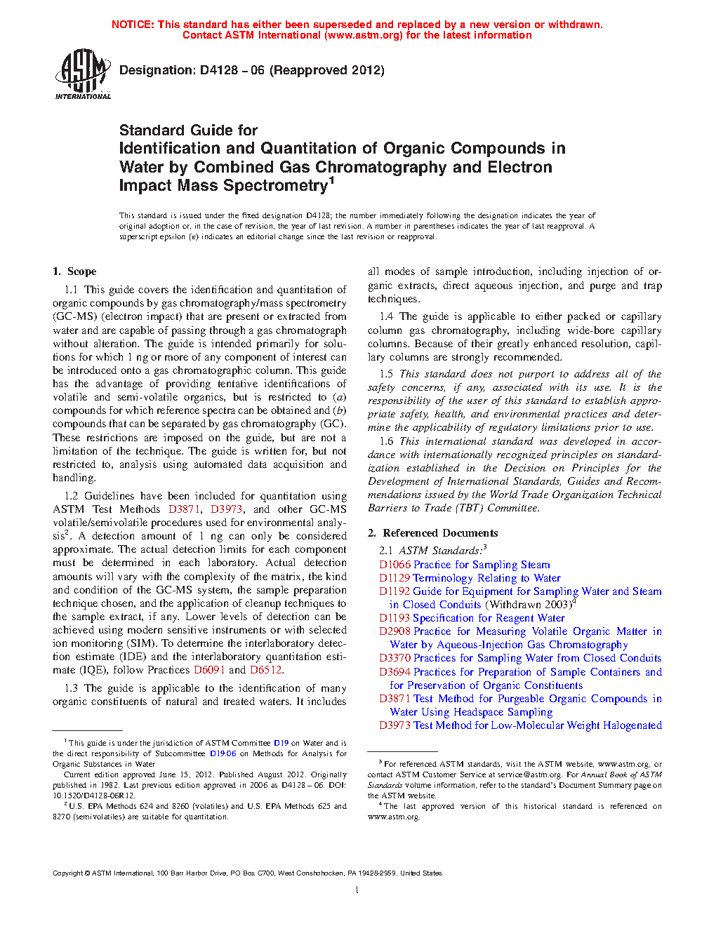 1.3 The guide is applicable to the identification of many organic constituents of natural and treated waters. It includes all modes of sample introduction, including injection of organic extracts, direct aqueous injection, and purge and trap techniques.