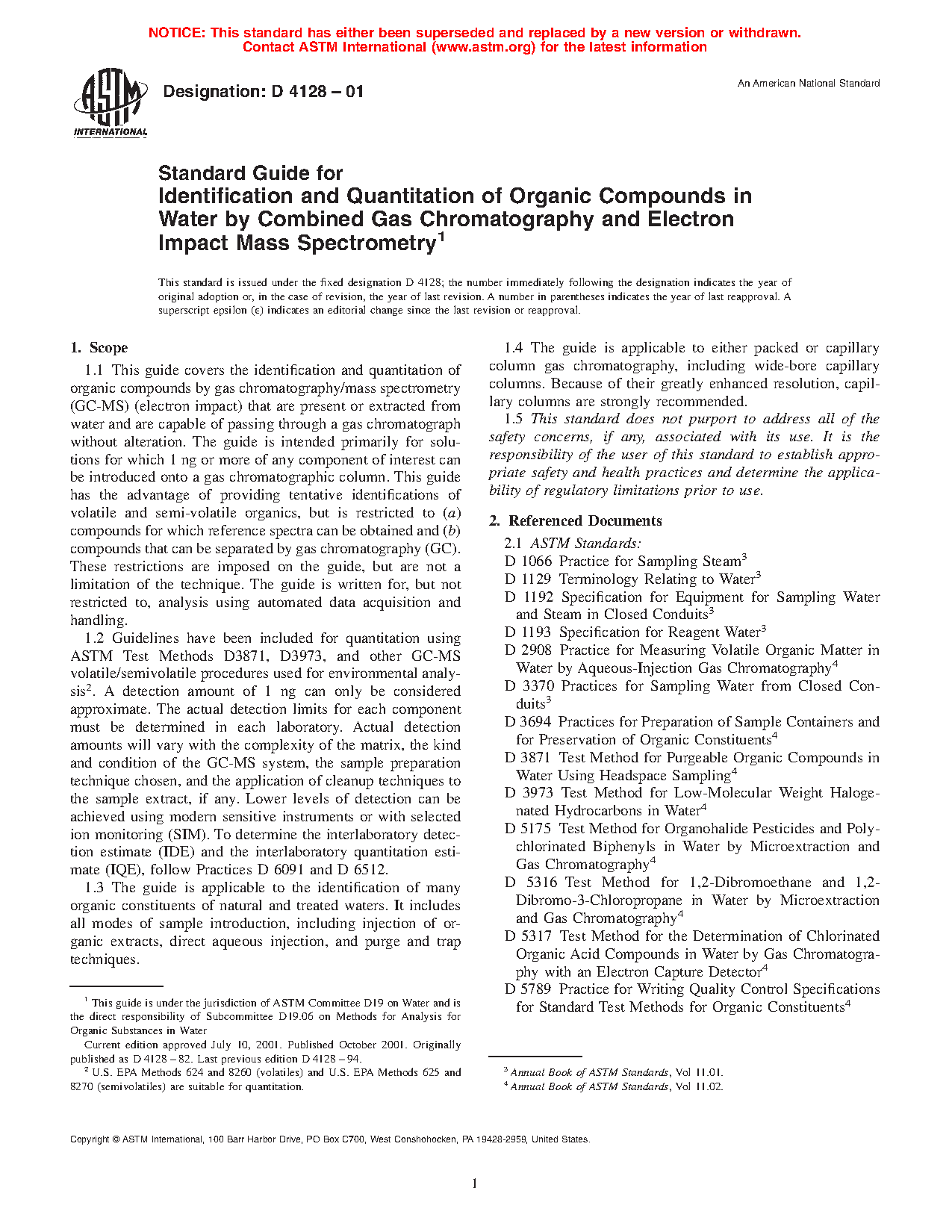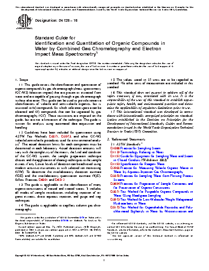 1.1 This guide covers the identification and quantitation of organic compounds by gas chromatography/mass spectrometry (GC-MS) (electron impact) that are present or extracted from water and are capable of passing through a gas chromatograph without alteration. This guide can be used to provide tentative identifications of volatile and semi-volatile organics, but is restricted to (a) compounds for which reference spectra can be obtained and (b) compounds that can be separated by gas chromatography (GC). These restrictions are imposed on the guide, but are not a limitation of the technique. The guide is written for analysis using automated data acquisition and handling.