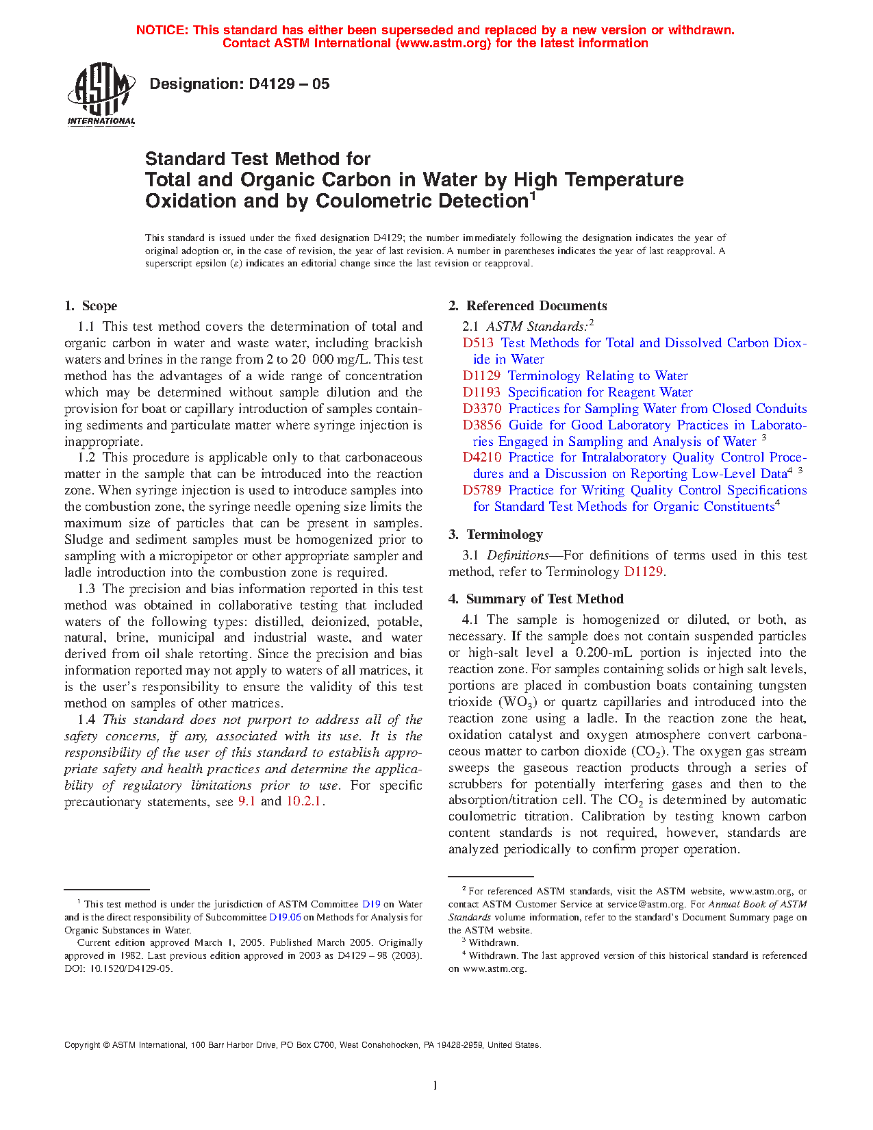 1.1 This test method covers the determination of total and organic carbon in water and waste water, including brackish waters and brines in the range from 2 to 20 000 mg/L. This test method has the advantages of a wide range of concentration which may be determined without sample dilution and the provision for boat or capillary introduction of samples containing sediments and particulate matter where syringe injection is inappropriate.