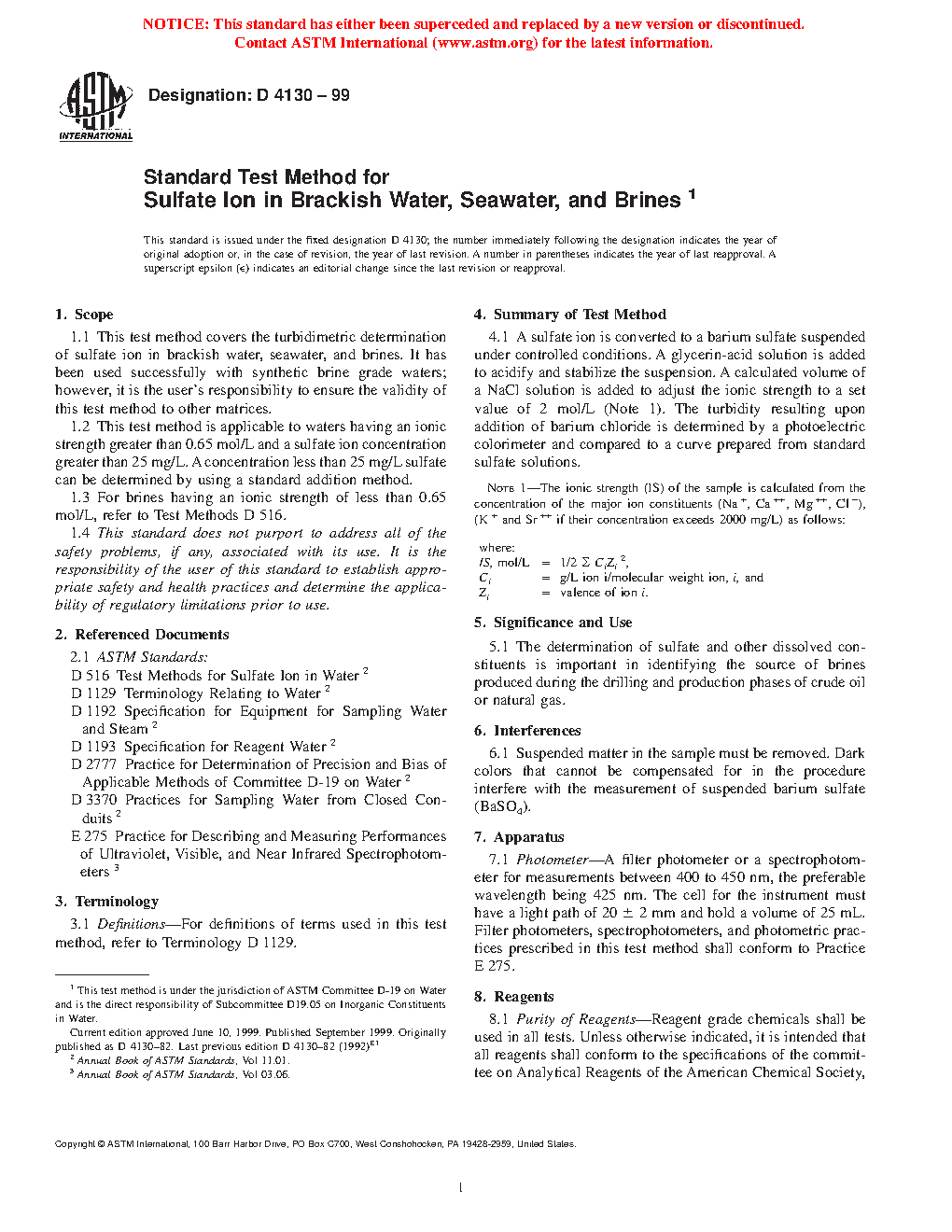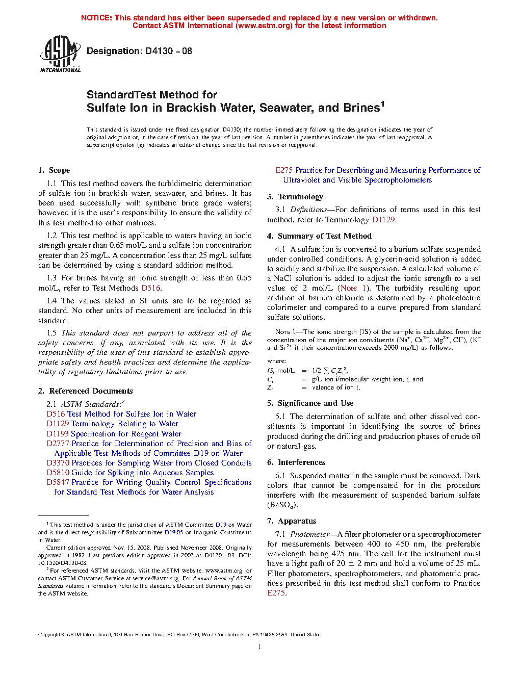 5.1 The determination of sulfate and other dissolved constituents is important in identifying the source of brines produced during the drilling and production phases of crude oil or natural gas.