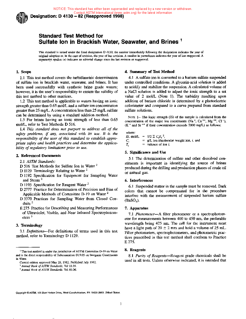 1.1 This test method covers the turbidimetric determination of sulfate ion in brackish water, seawater, and brines. It has been used successfully with synthetic brine grade waters; however, it is the user's responsibility to ensure the validity of this test method to other matrices.