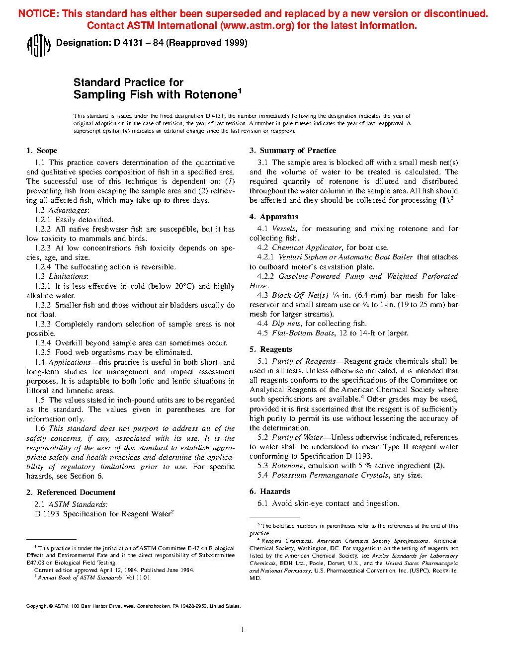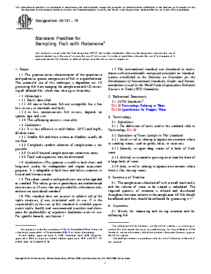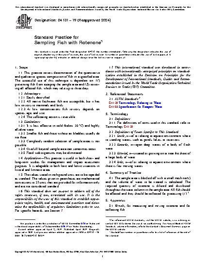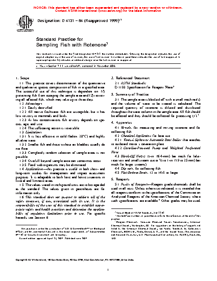 1.1 This practice covers determination of the quantitative and qualitative species composition of fish in a specified area. The successful use of this technique is dependent on: (1) preventing fish from escaping the sample area and (2) retrieving all affected fish, which may take up to three days.