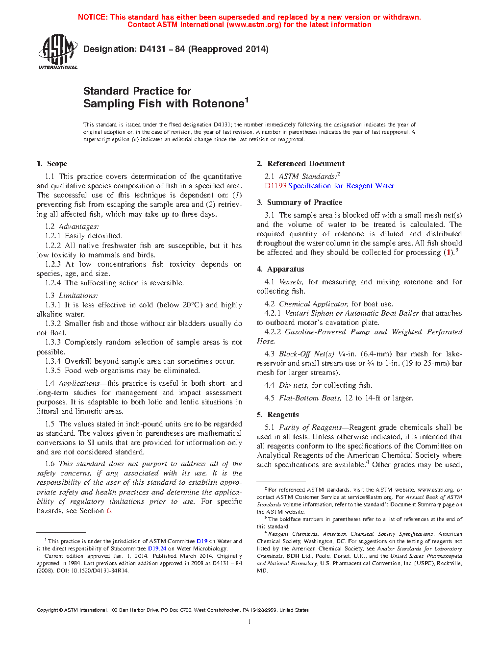 This practice covers determination of the quantitative and qualitative species composition of fish in a specified area. The successful use of this technique is dependent on: (1) preventing fish from escaping the sample area and (2) retrieving all affected fish, which may take up to three days. This practice is useful in both short- and long-term studies for management and impact assessment purposes. The sample area is blocked off with a small mesh net(s) and the volume of water to be treated is calculated. The required quantity of rotenone is diluted and distributed throughout the water column in the sample area. All fish should be affected and they should be collected for processing.