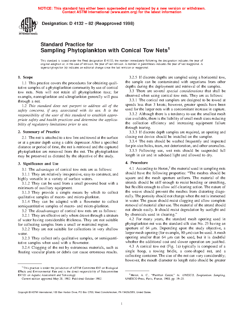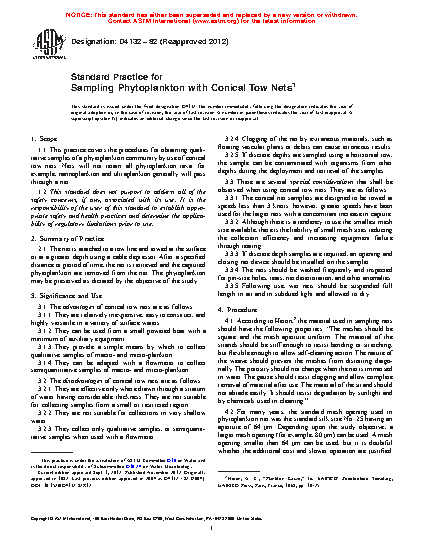 1.1 This practice covers the procedures for obtaining qualitative samples of a phytoplankton community by use of conical tow nets. Nets will not retain all phytoplankton taxa; for example, nannoplankton and ultraplankton generally will pass through a net.