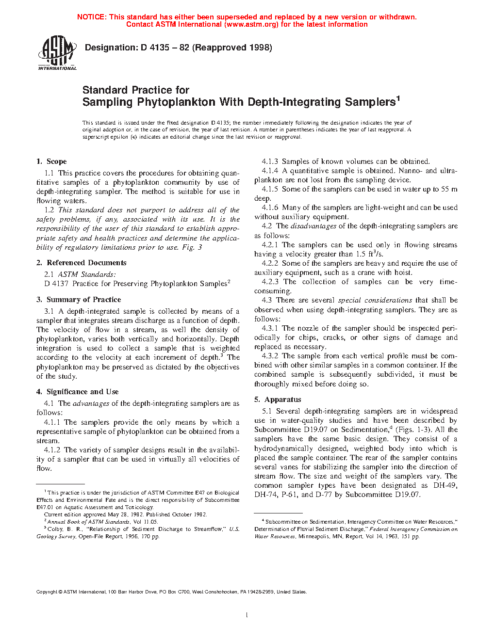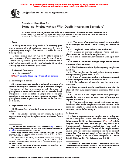 1.1 This practice covers the procedures for obtaining quantitative samples of a phytoplankton community by use of depth-integrating sampler. The method is suitable for use in flowing waters.