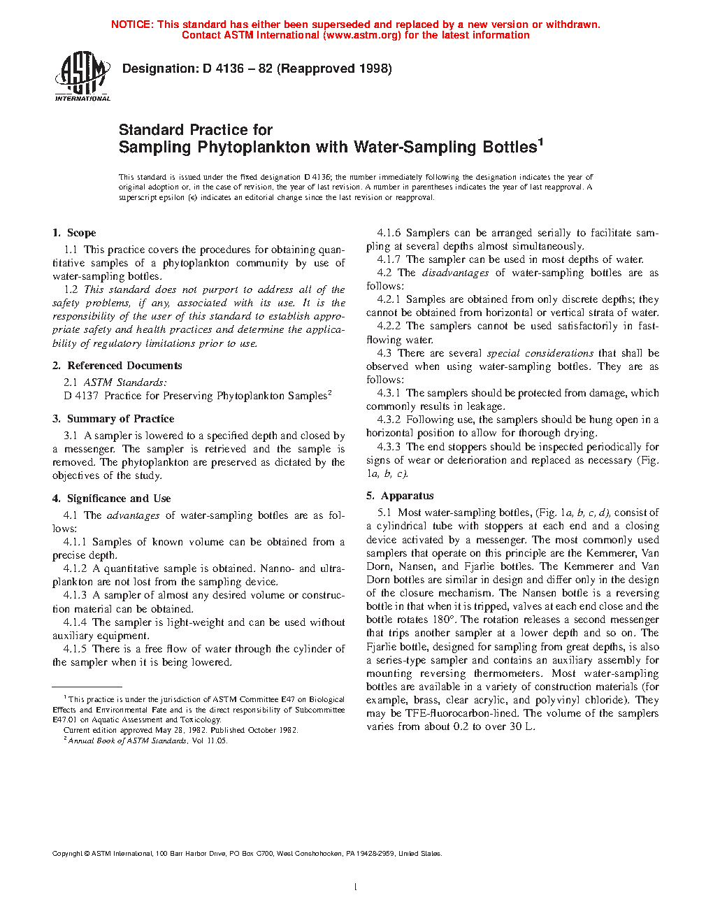 1.1 This practice covers the procedures for obtaining quantitative samples of a phytoplankton community by use of water-sampling bottles.