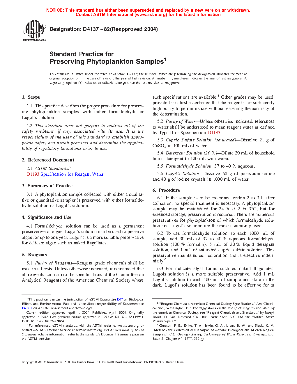 1.1 This practice describes the proper procedure for preserving phytoplankton samples with either formaldehyde or Lugol's solution