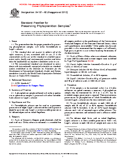 Standard Practice for Preserving Phytoplankton Samples