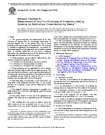 1.1 This practice describes the measurement of dry film thickness of coating films by microscopic observation of precision angular cuts in the coating film. Use of these procedures may require repair of the coating film. This practice is intended to supplement the manufacturers' instructions for the manual operation of the gages and is not intended to replace them. It includes definitions of key terms, reference documents, the significance and use of the practice, and the advantages and limitations of the instruments.