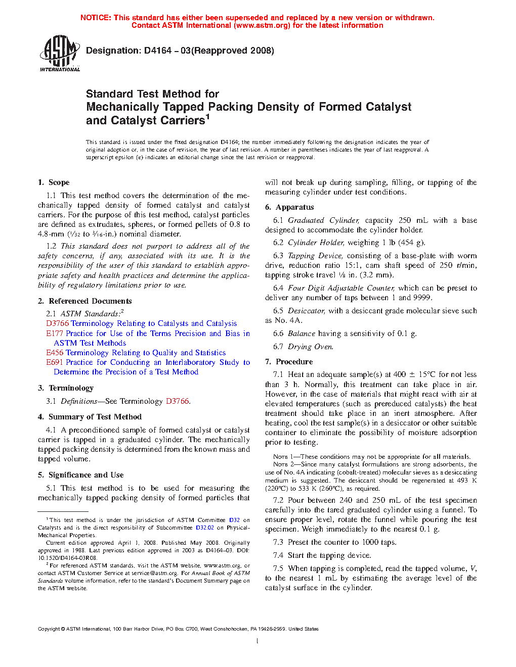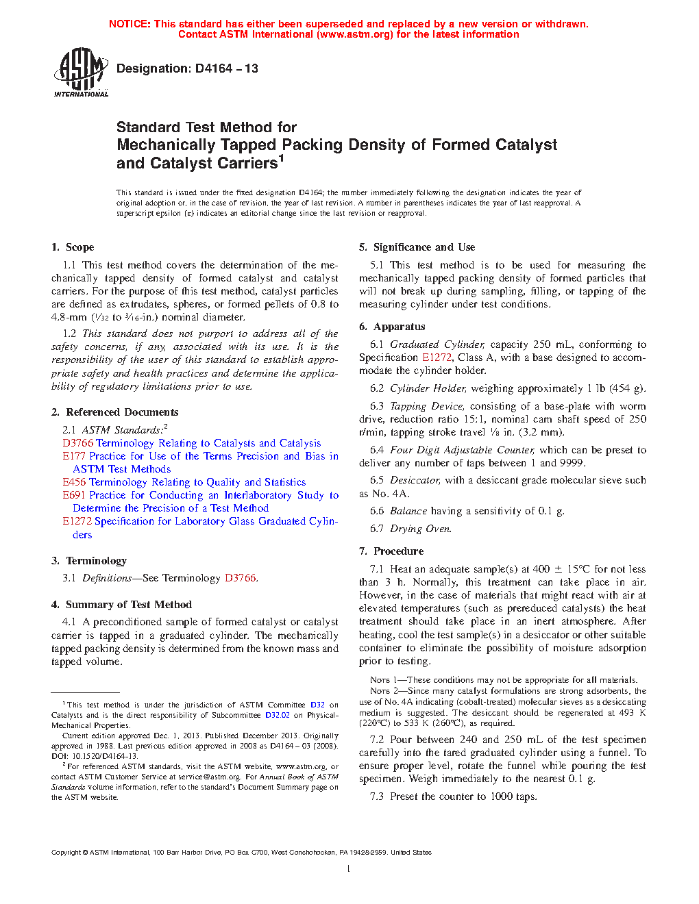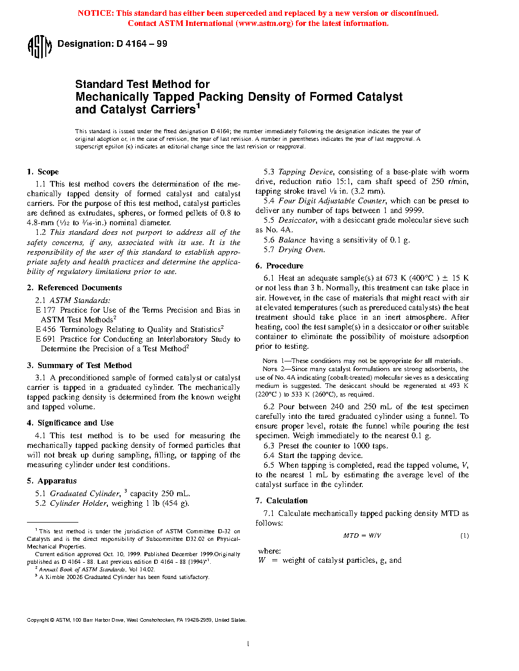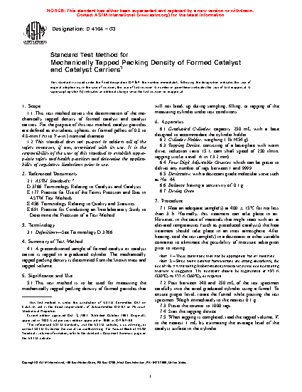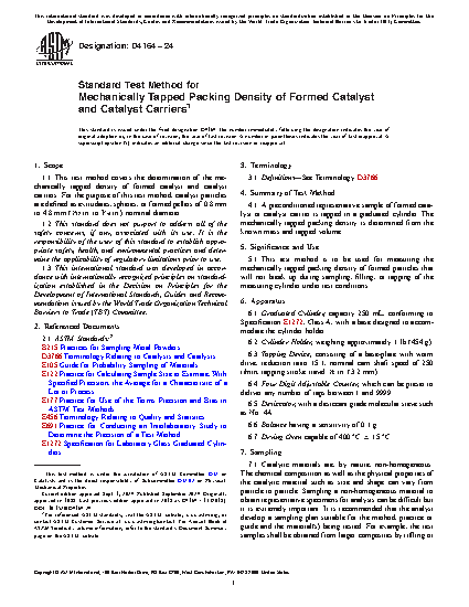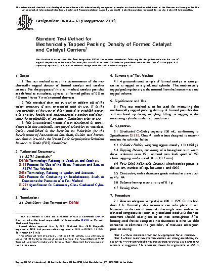 1.1 This test method covers the determination of the mechanically tapped density of formed catalyst and catalyst carriers. For the purpose of this test method, catalyst particles are defined as extrudates, spheres, or formed pellets of 0.8 to 4.8-mm (1/32 to 3/16-in.) nominal diameter.
