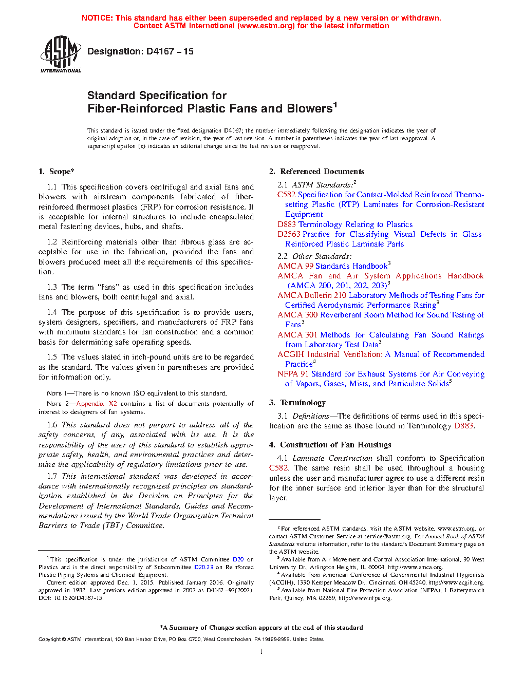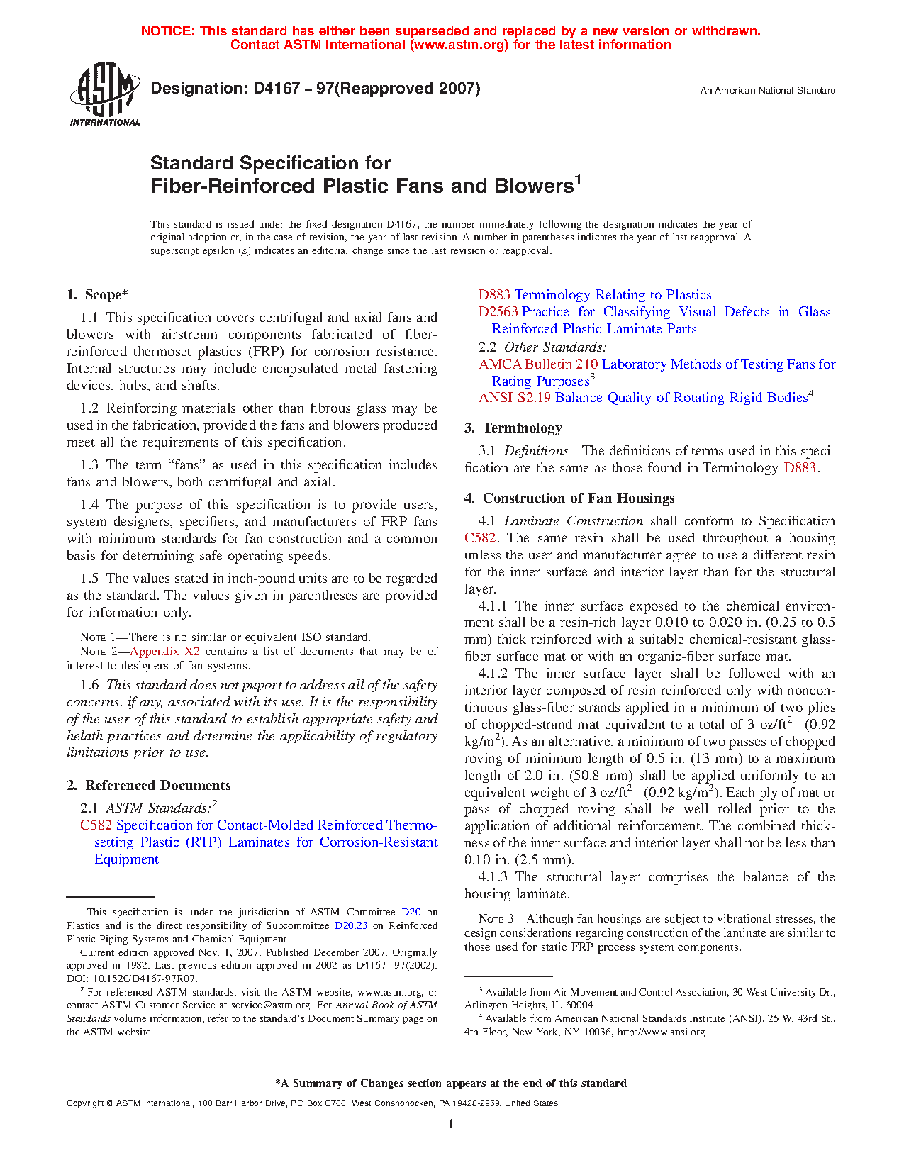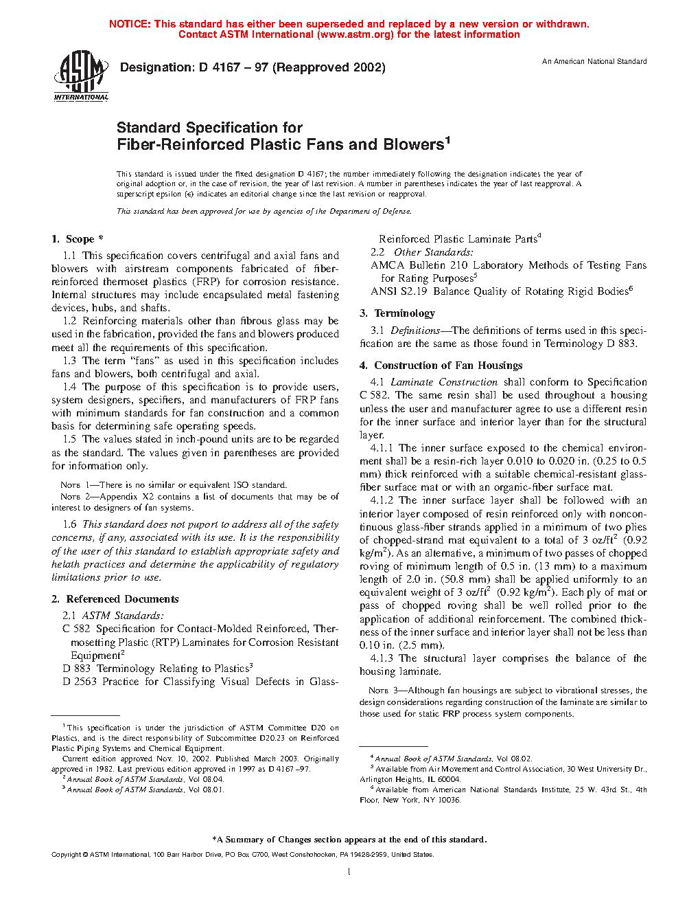 This specification covers the minimum requirements for construction of fiber-reinforced thermoset plastic fans (both centrifugal and axial) and blowers, and provides for a common basis for determining safe operating speeds. The fan housing shall be of laminate construction consisting of a resin-rich inner surface layer reinforced with a chemical-resistant glass-fiber or organic-fiber surface mat and an interior layer made of resin reinforced only with noncontinuous glass-fiber strands. Fan wheels shall be manufactured from a corrosion-resistant material as well, with visible defects limited only to the requirements specified. Further rendering the fan wheel and housing electrostatically conductive shall result in a spark-resistant fan. Tests for balance, fan aerodynamic rating, and safe operating speed shall be performed and shall conform to the requirements specified.