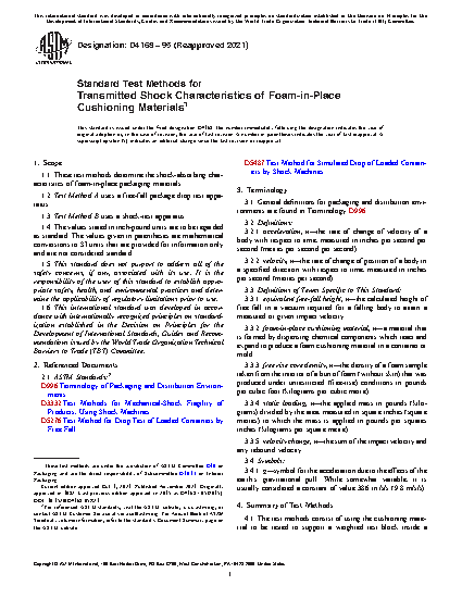 5.2 These methods, in contrast to other methods that usually test only the cushioning foam, are designed to evaluate foam-in-place cushioning materials in a manner in which the foam-in-place packaging material is used. In particular, the method includes simultaneous use of a plastic film, the foam, and the box usually used in this method of packaging. See Fig. 1.