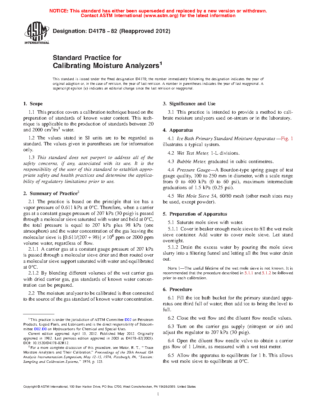 1.1 This practice covers a calibration technique based on the preparation of standards of known water content. This technique is applicable to the production of standards between 20 cm3/m3 and 2000 cm3/m3 water.
