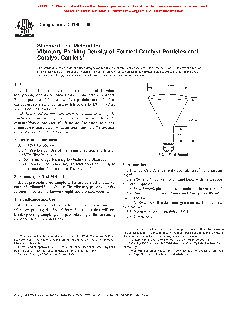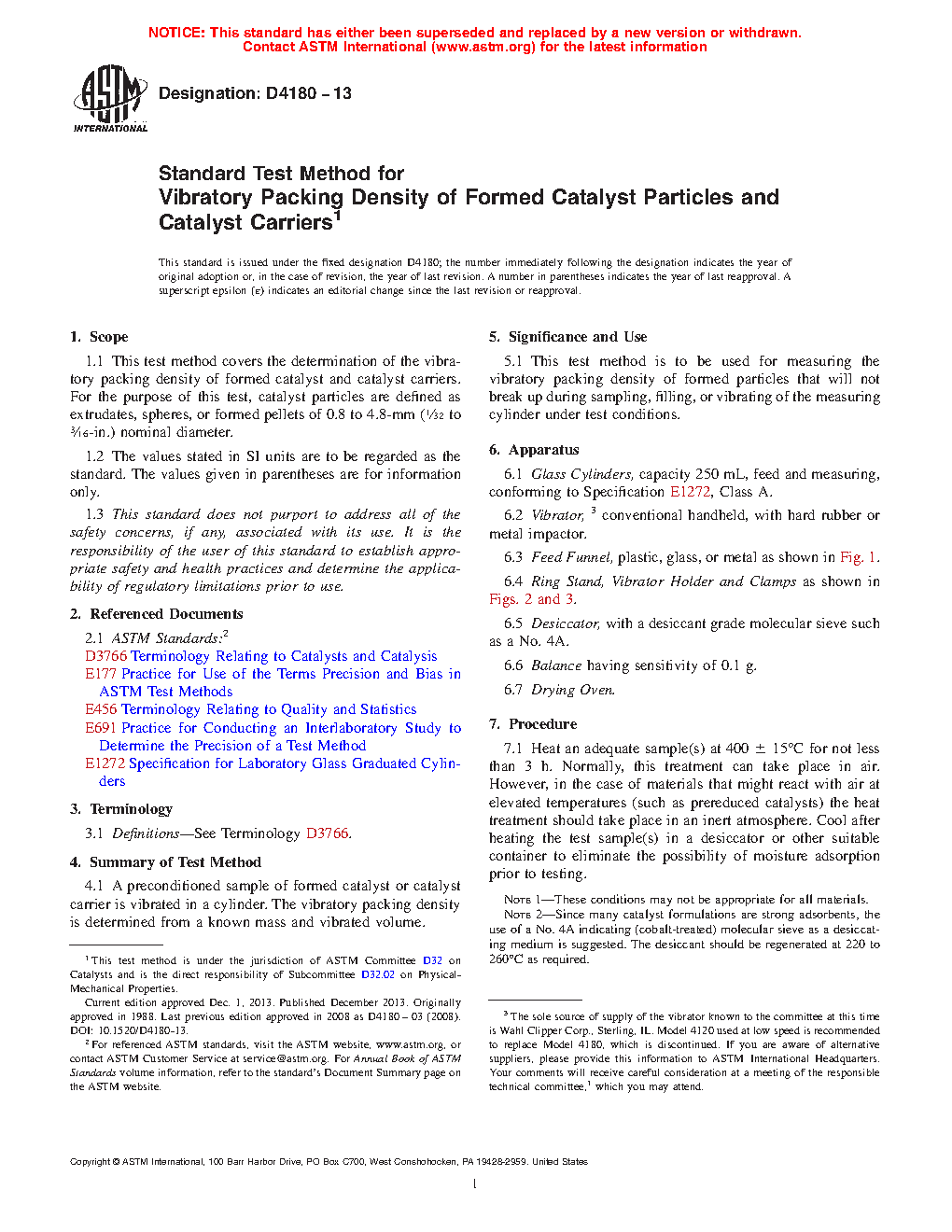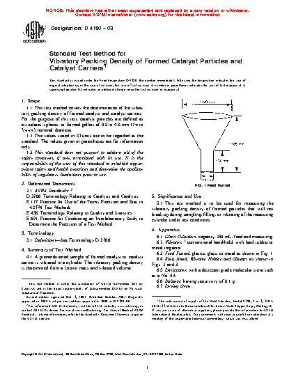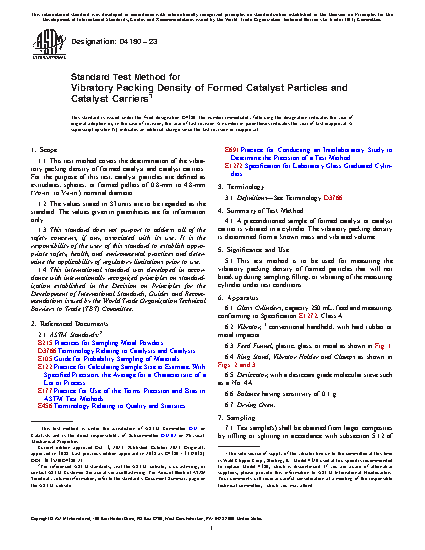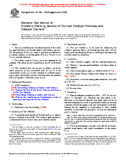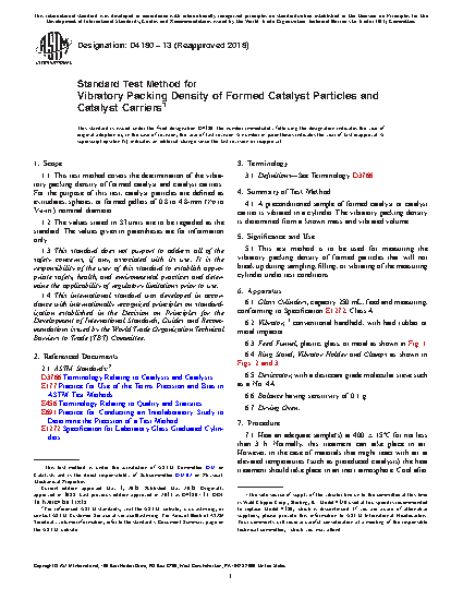 1.1 This test method covers the determination of the vibratory packing density of formed catalyst and catalyst carriers. For the purpose of this test, catalyst particles are defined as extrudates, spheres, or formed pellets of 0.8 to 4.8-mm ( 1/32 to 3/16-in.) nominal diameter.