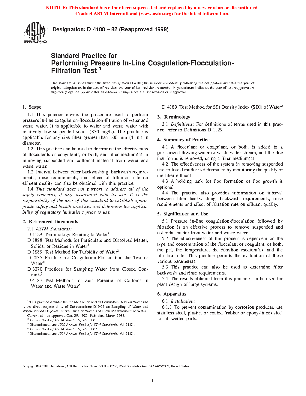 1.1 This practice covers the procedure used to perform pressure in-line coagulation-flocculation-filtration of water and waste water. It is applicable to water and waste water with relatively low suspended solids (<30 mg/L). The practice is applicable for any size filter greater than 100 mm (4 in.) in diameter.
