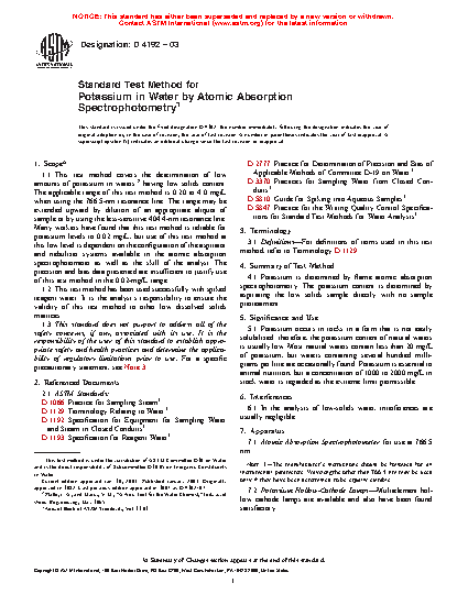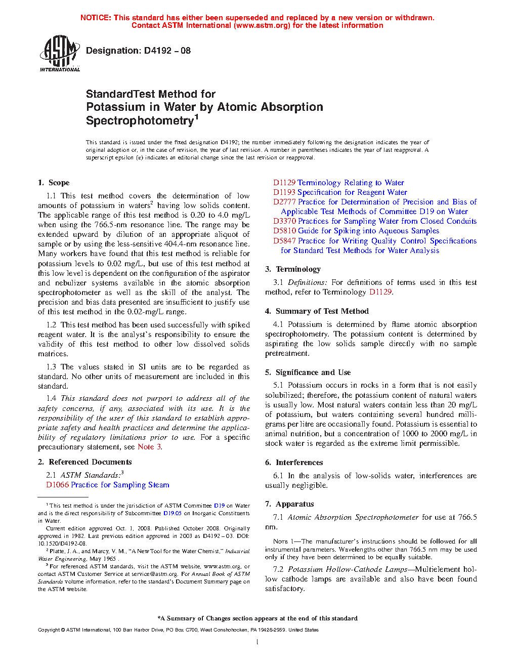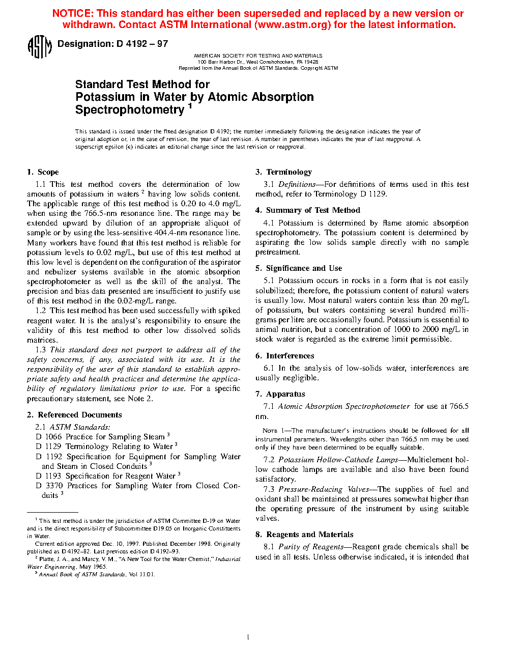 1.1 This test method covers the determination of low amounts of potassium in waters2 having low solids content. The applicable range of this test method is 0.20 to 4.0 mg/L when using the 766.5-nm resonance line. The range may be extended upward by dilution of an appropriate aliquot of sample or by using the less-sensitive 404.4-nm resonance line. Many workers have found that this test method is reliable for potassium levels to 0.02 mg/L, but use of this test method at this low level is dependent on the configuration of the aspirator and nebulizer systems available in the atomic absorption spectrophotometer as well as the skill of the analyst. The precision and bias data presented are insufficient to justify use of this test method in the 0.02-mg/L range.