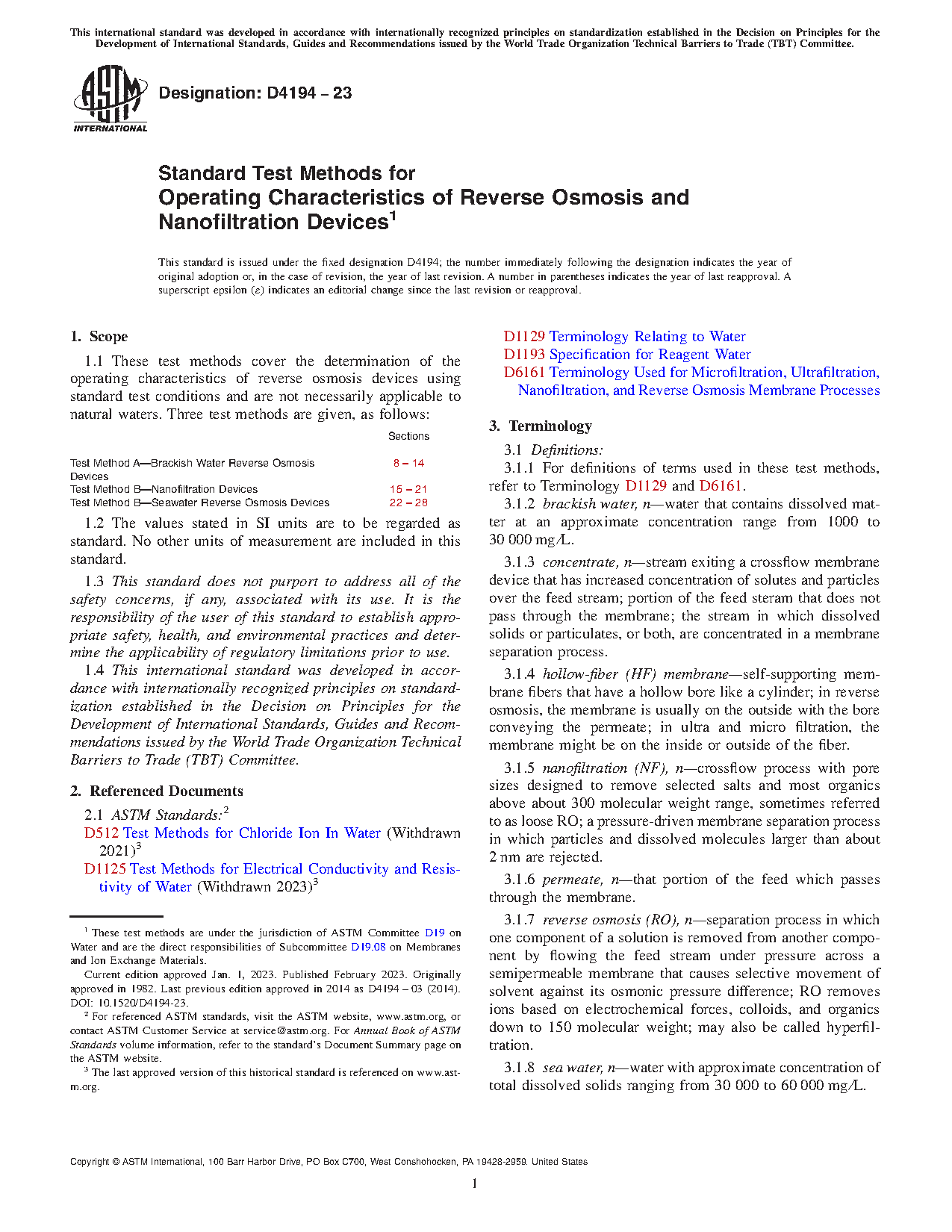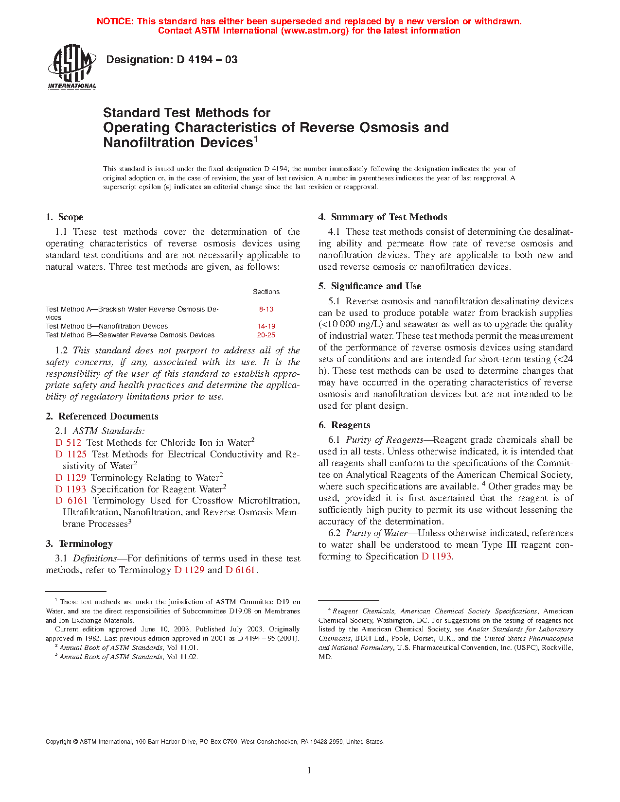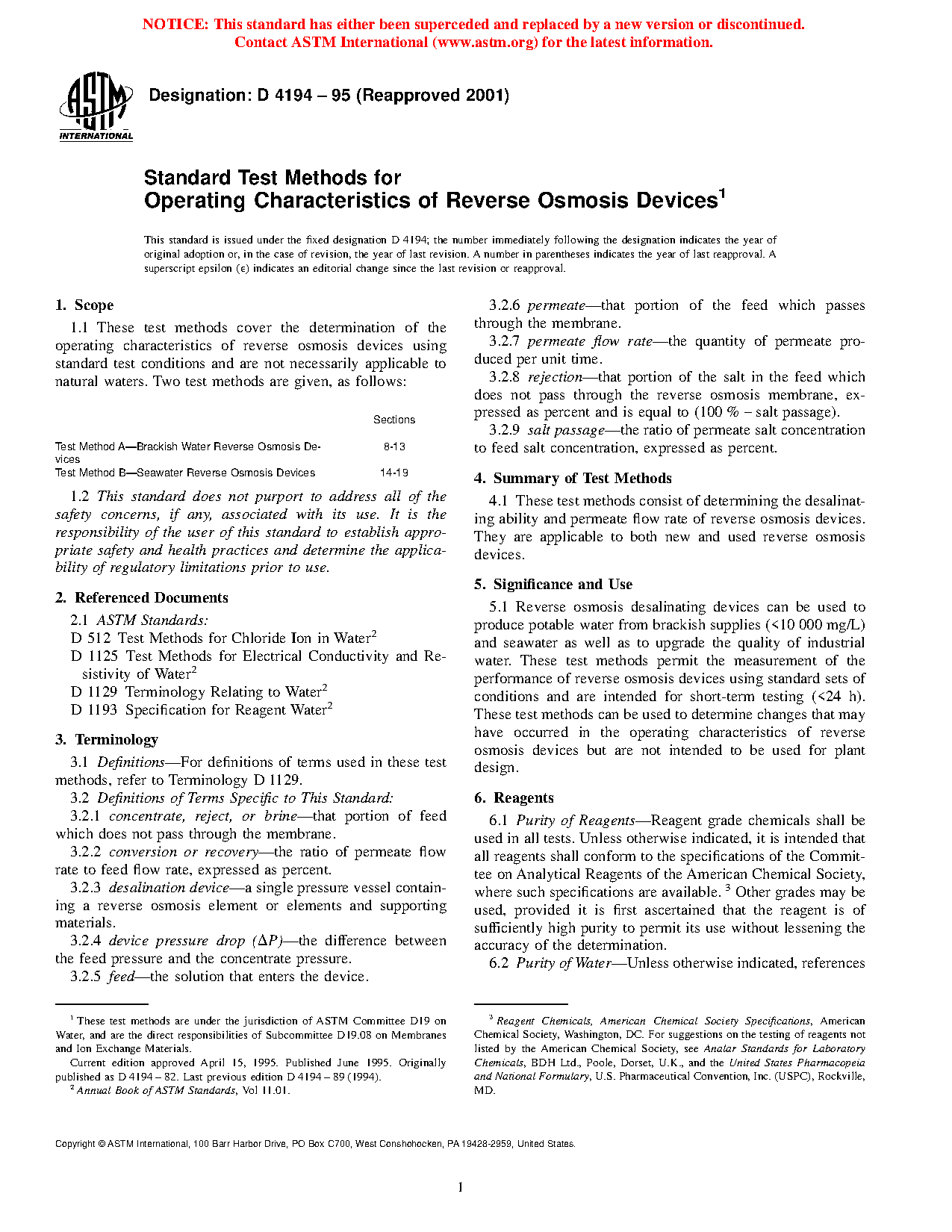 1.1 These test methods cover the determination of the operating characteristics of reverse osmosis devices using standard test conditions and are not necessarily applicable to natural waters. Three test methods are given, as follows: