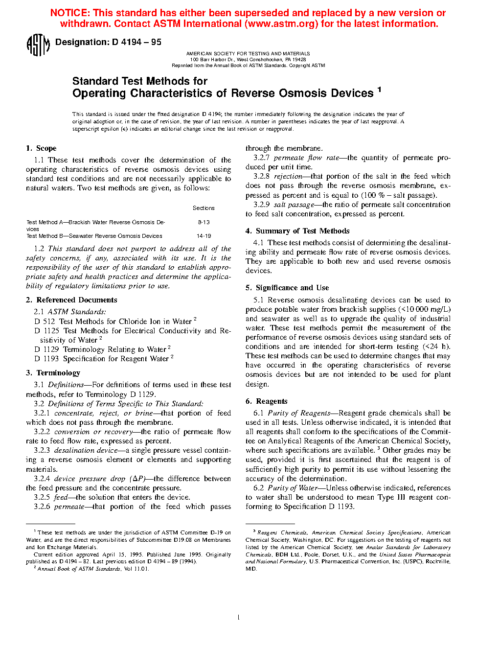 1.1 These test methods cover the determination of the operating characteristics of reverse osmosis devices using standard test conditions and are not necessarily applicable to natural waters. Three test methods are given, as follows: