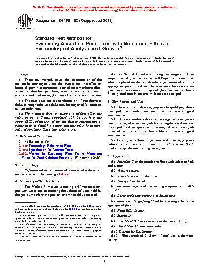 These test methods are appropriate for qualifying absorbent pads used with membrane filters for bacteriological enumeration.