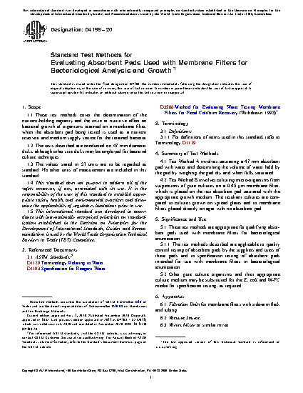 1.1 These test methods cover the determination of the nutrient-holding capacity and the toxic or nutritive effect on bacterial growth of organisms retained on a membrane filter, when the absorbent pad being tested is used as a nutrient reservoir and medium supply source for the retained bacteria.