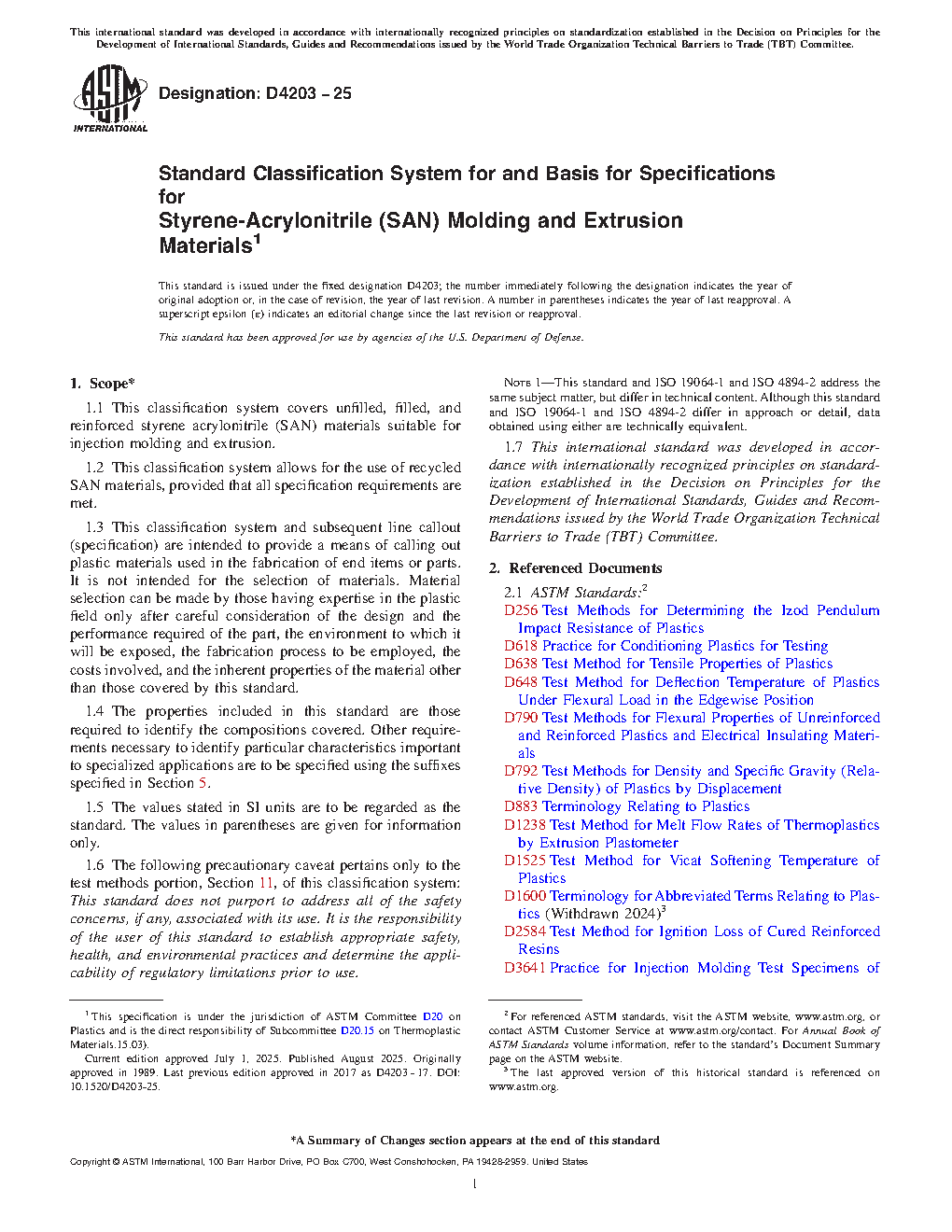 1.1 This specification covers unfilled, filled, and reinforced styrene acrylonitrile (SAN) materials suitable for injection molding and extrusion.