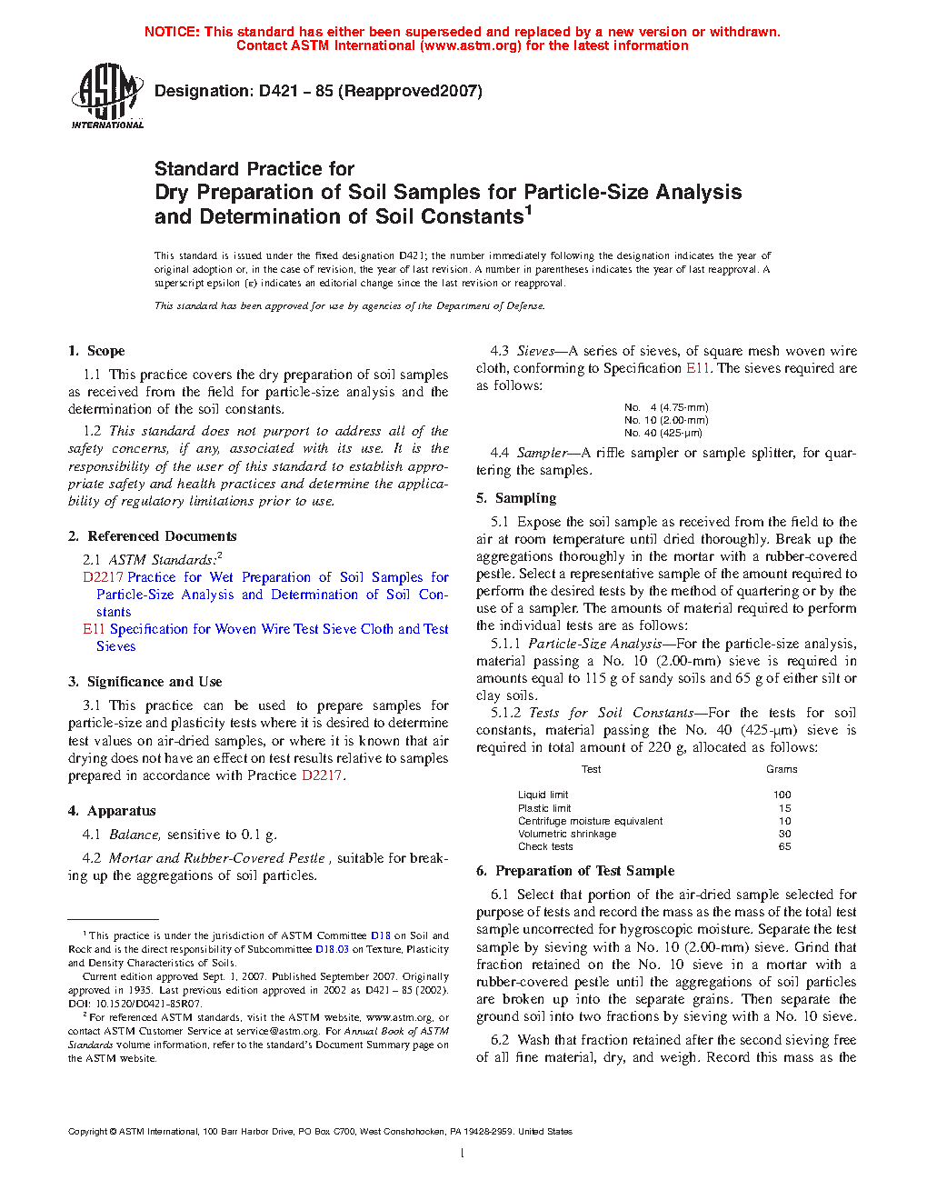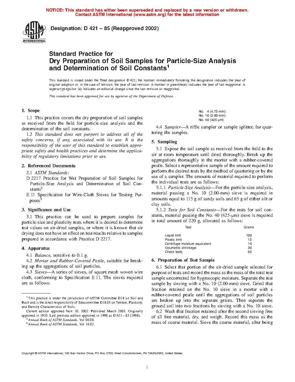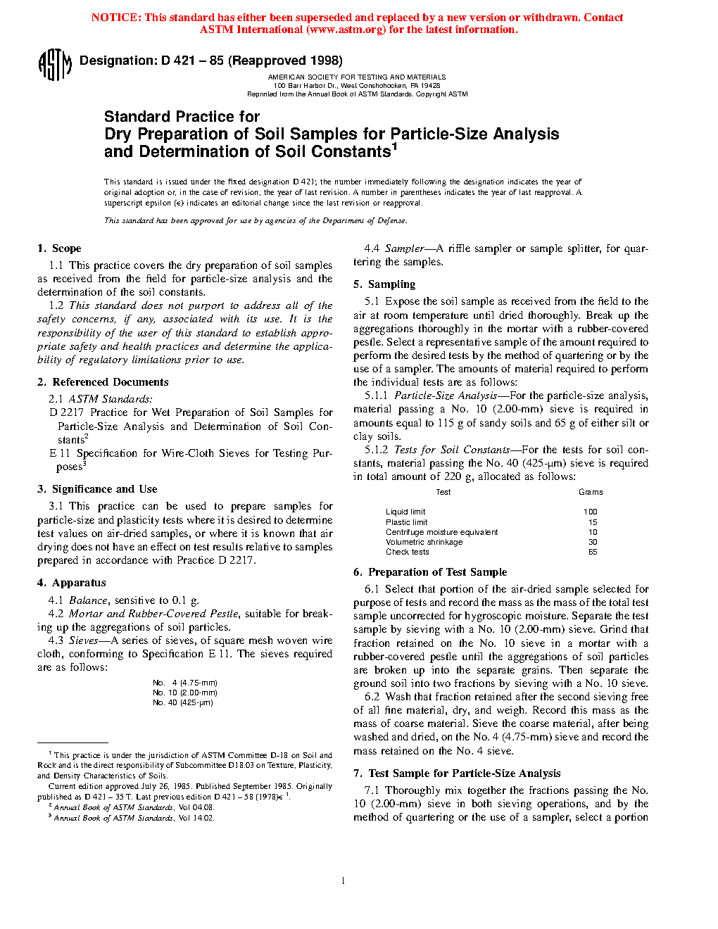Standard Practice for Dry Preparation of Soil Samples for Particle-Size Analysis and Determination of Soil Constants (Withdrawn 2016)