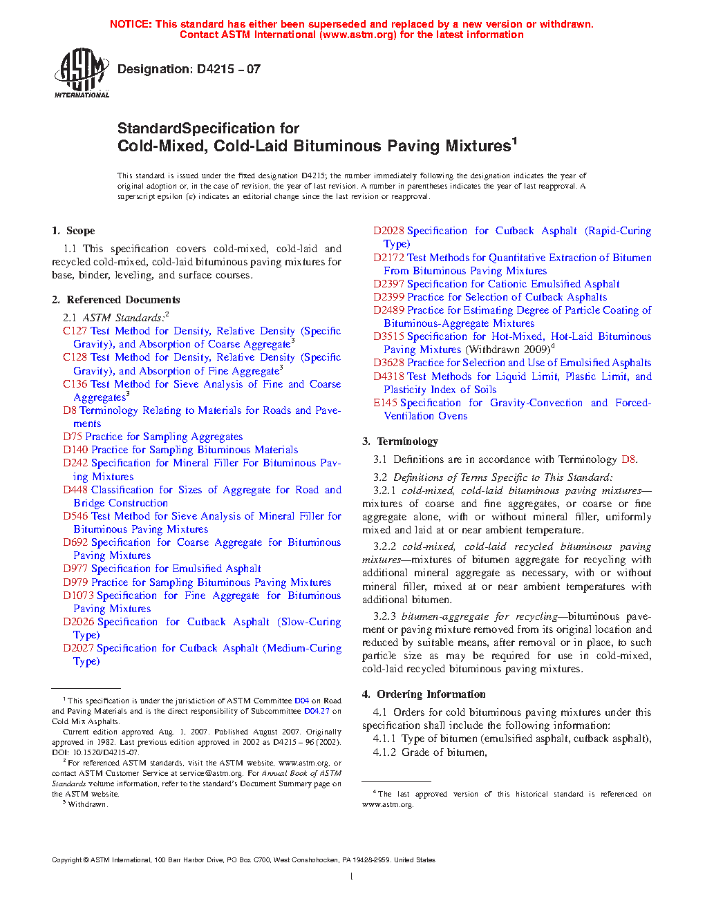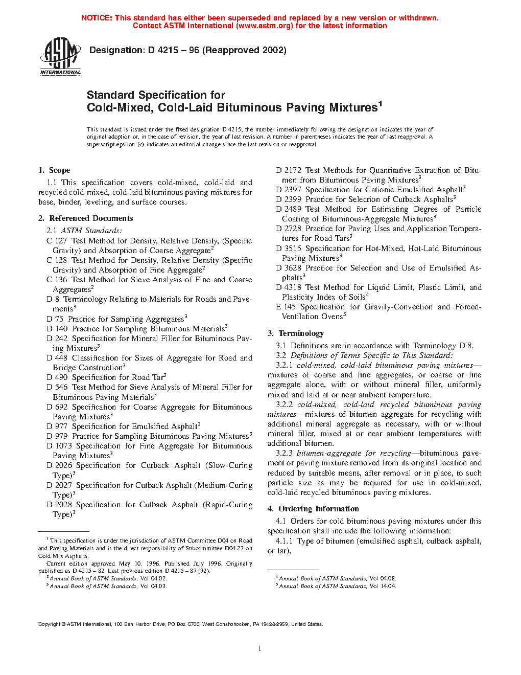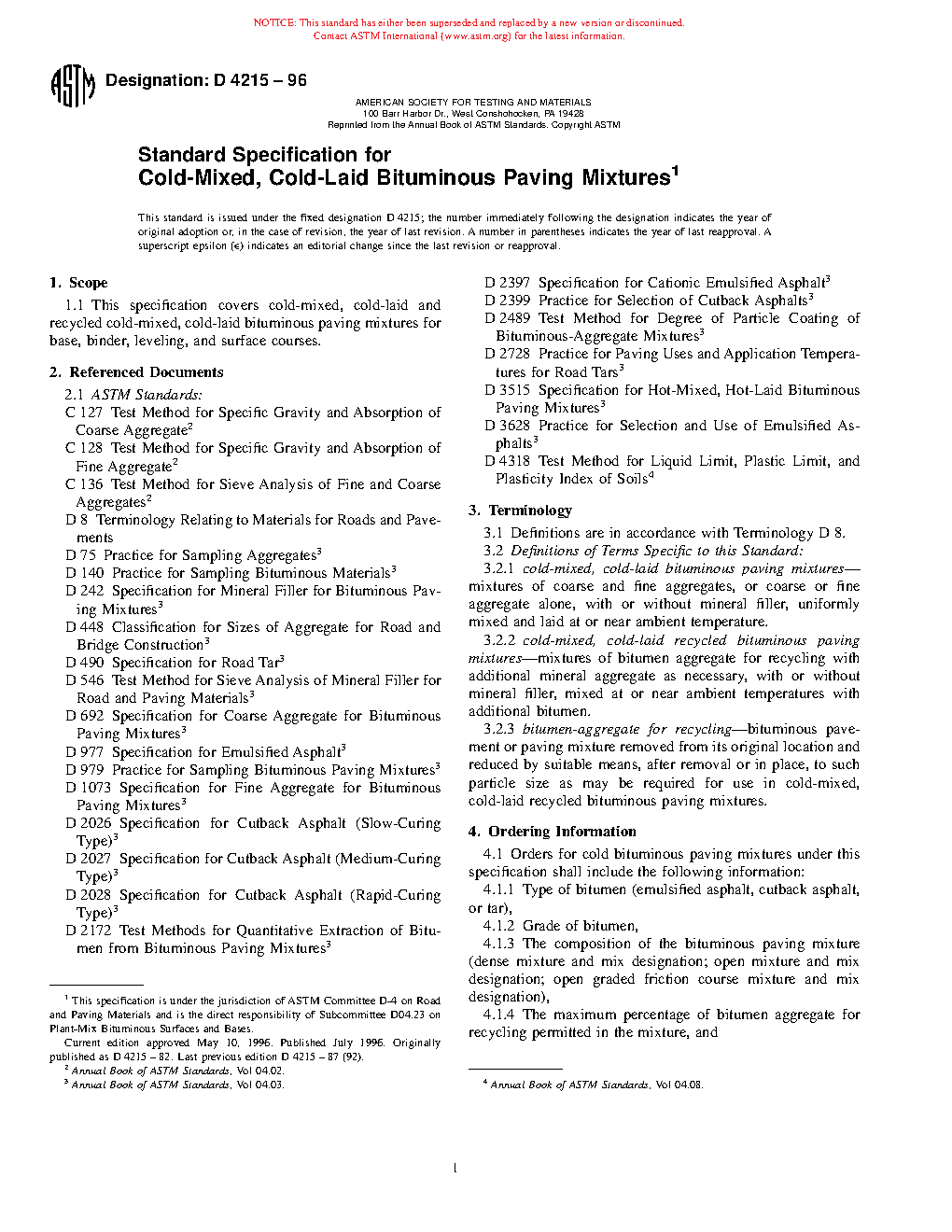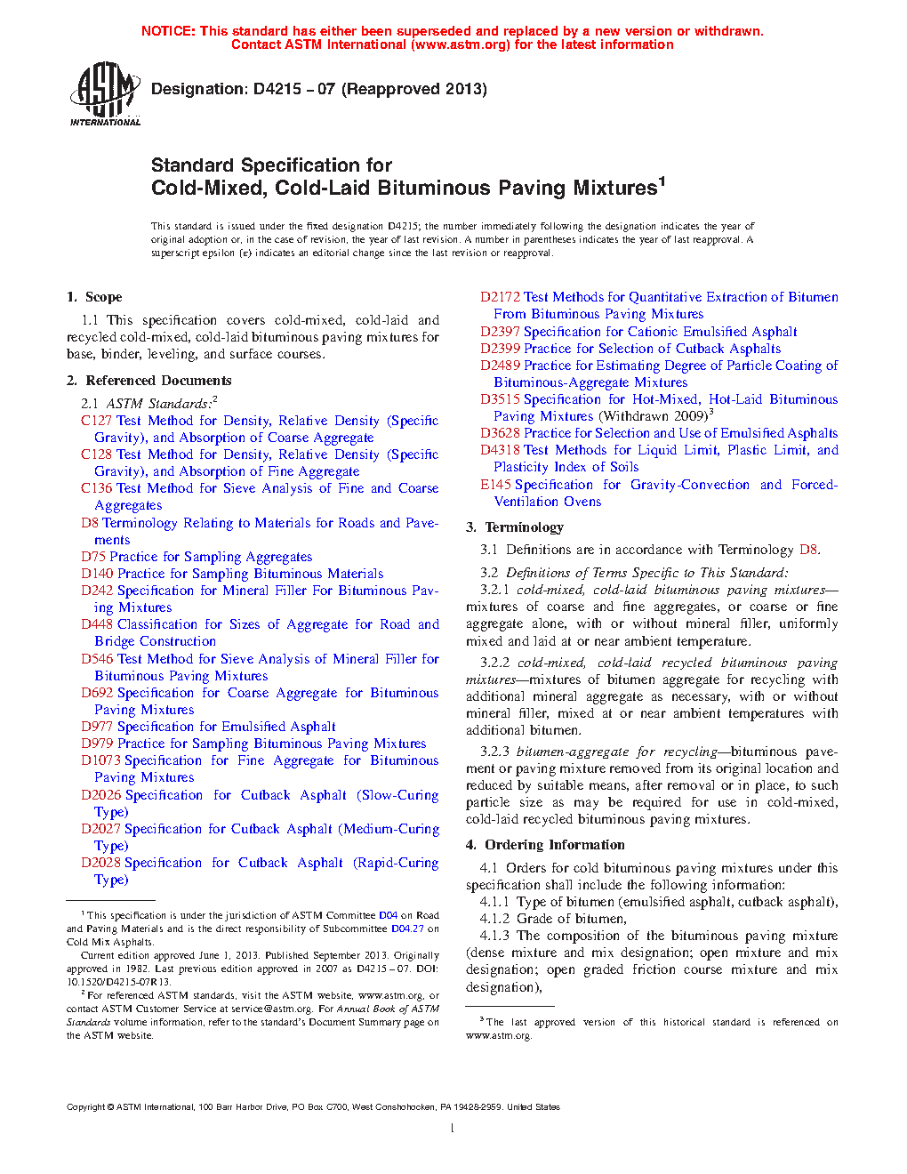 1.1 This specification covers cold-mixed, cold-laid and recycled cold-mixed, cold-laid asphalt paving mixtures for base, binder, leveling, and surface courses.