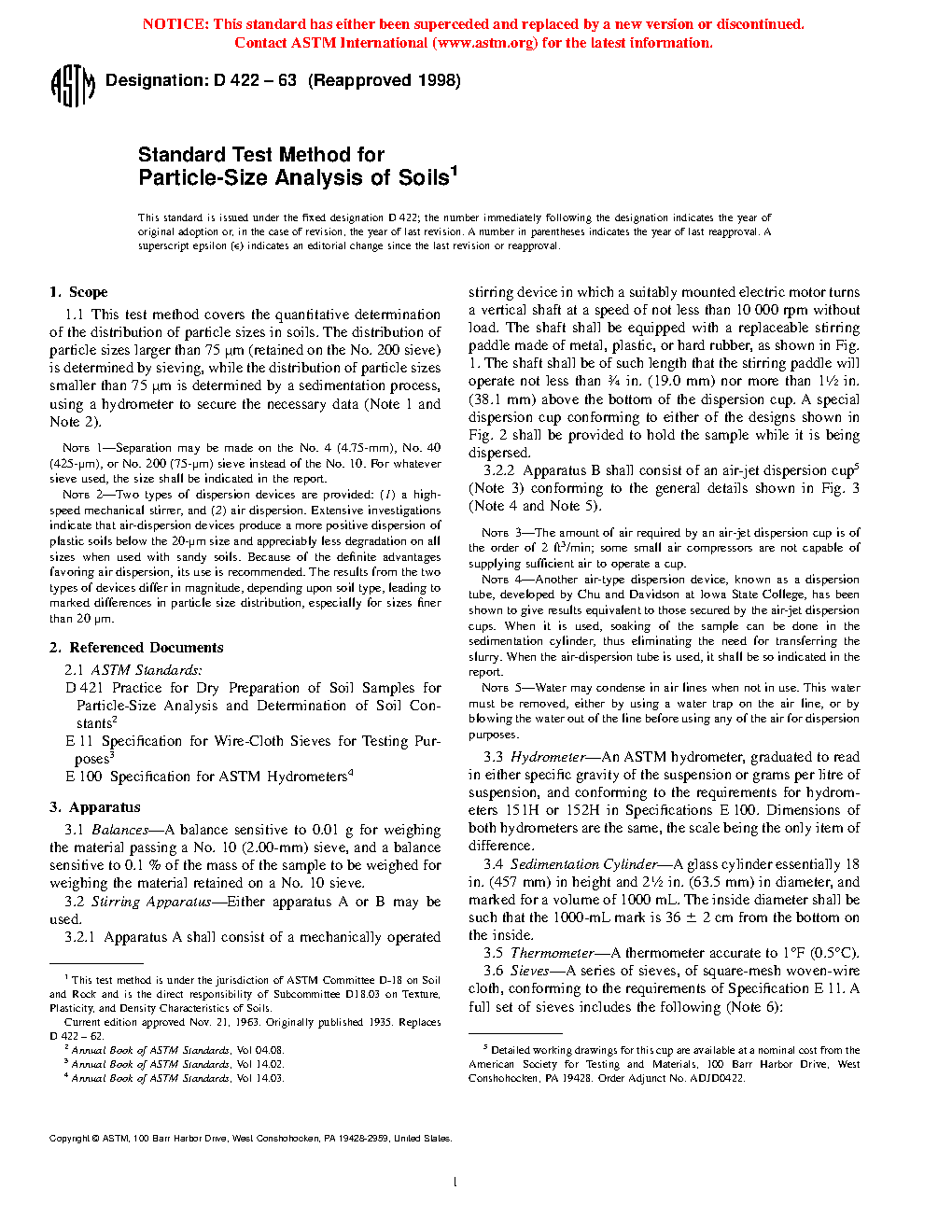 1.1 This test method covers the quantitative determination of the distribution of particle sizes in soils. The distribution of particle sizes larger than 75 μm (retained on the No. 200 sieve) is determined by sieving, while the distribution of particle sizes smaller than 75 μm is determined by a sedimentation process, using a hydrometer to secure the necessary data (Note 1 and Note 2).