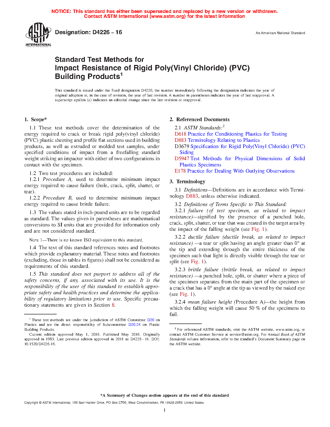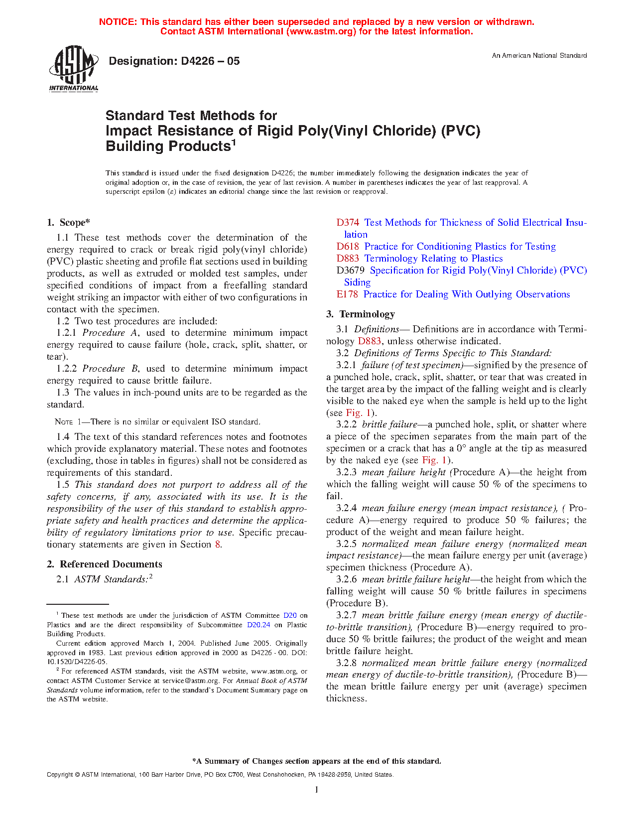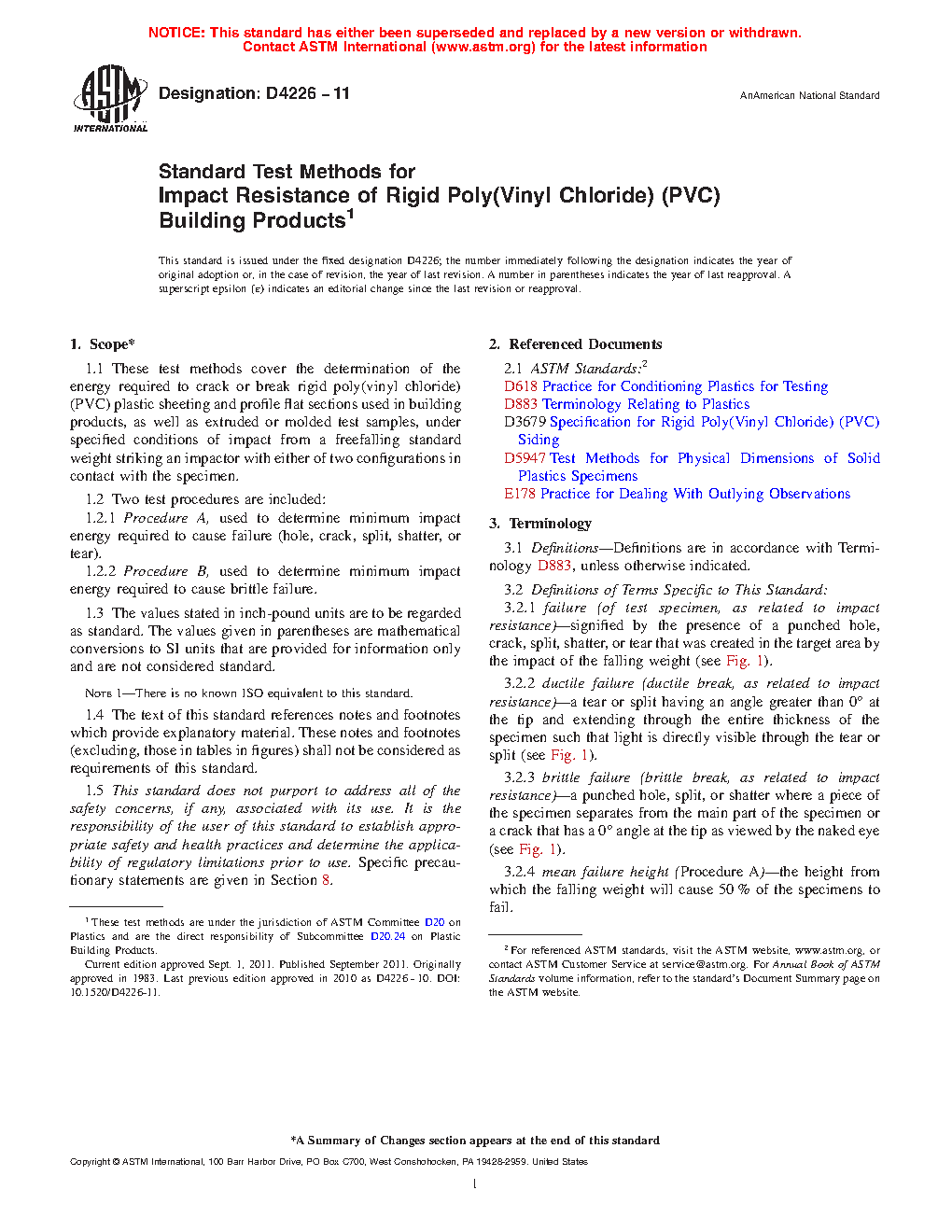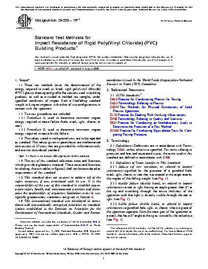 1.1 These test methods cover the determination of the energy required to crack or break rigid poly(vinyl chloride) (PVC) plastic sheeting and profile flat sections used in building products, as well as extruded or molded test samples, under specified conditions of impact from a freefalling standard weight striking an impactor with either of two configurations in contact with the specimen.