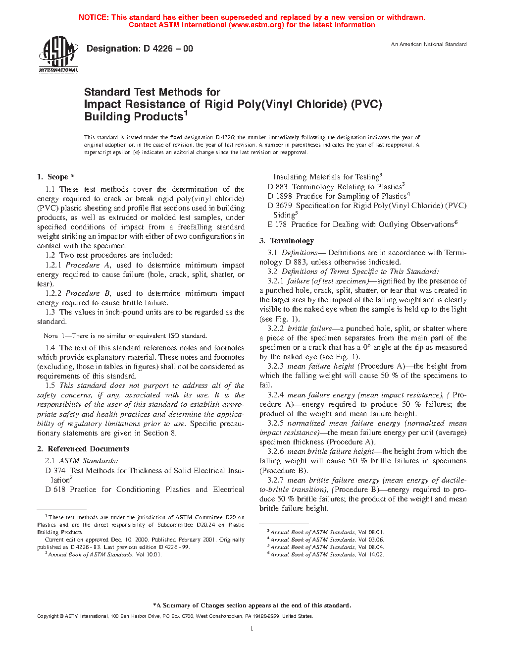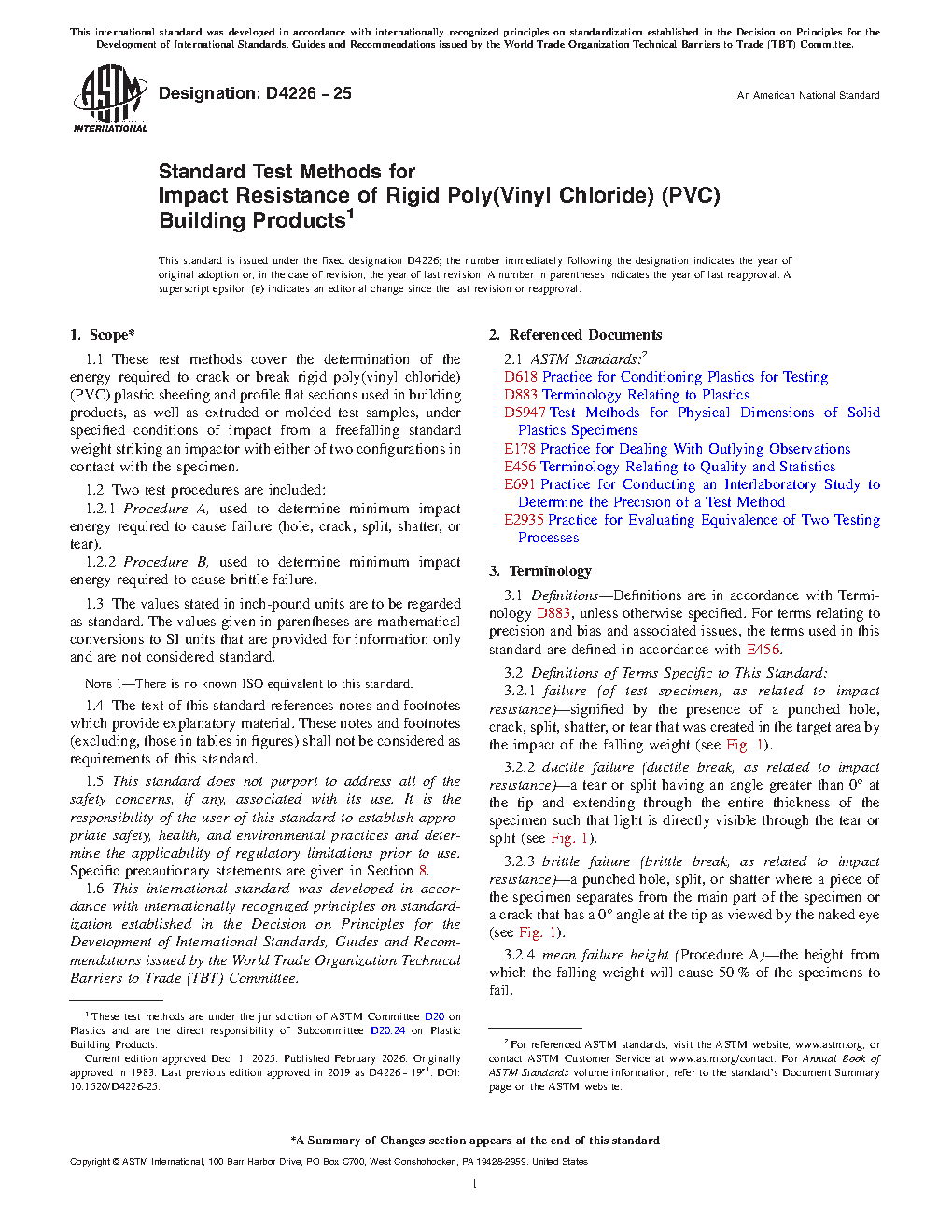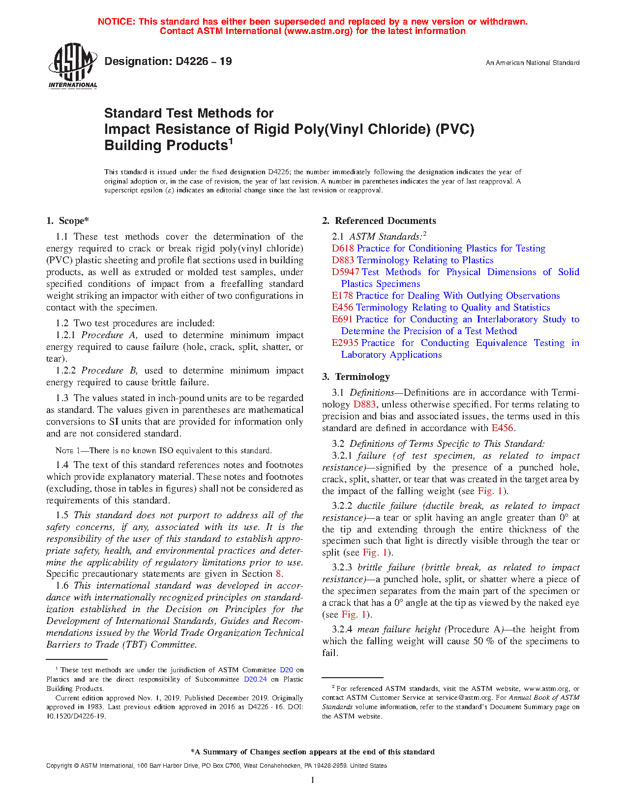 1.1 These test methods cover the determination of the energy required to crack or break rigid poly(vinyl chloride) (PVC) plastic sheeting and profile flat sections used in building products, as well as extruded or molded test samples, under specified conditions of impact from a freefalling standard weight striking an impactor with either of two configurations in contact with the specimen.