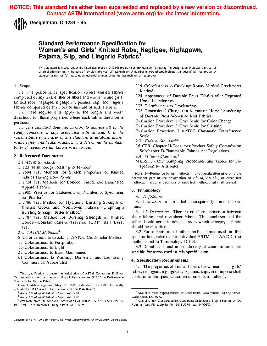 1.1 This performance specification covers knitted fabrics comprised of any textile fiber or fibers and women's and girls' knitted robe, negligee, nightgown, pajama, slip, and lingerie fabrics composed of any fiber or mixture of textile fibers.