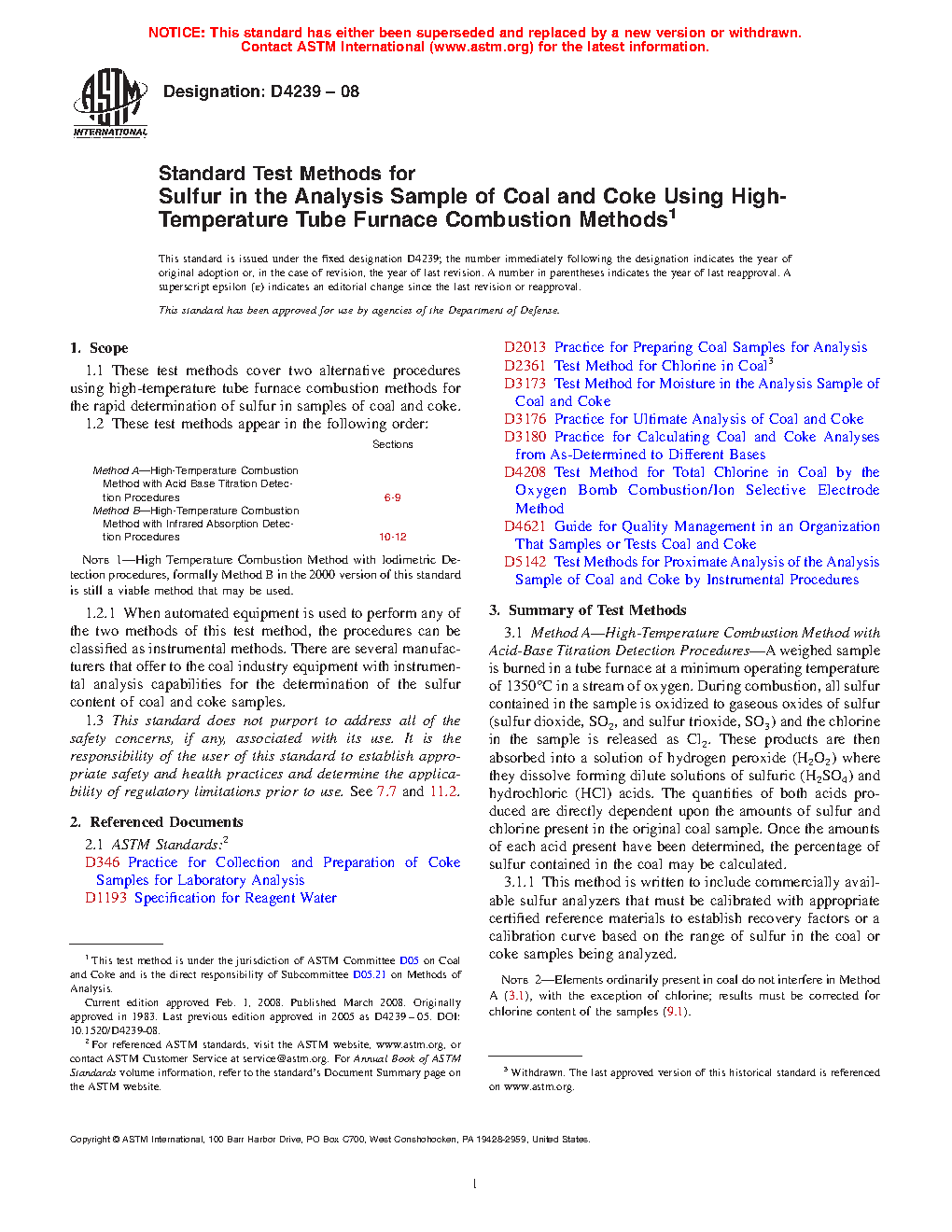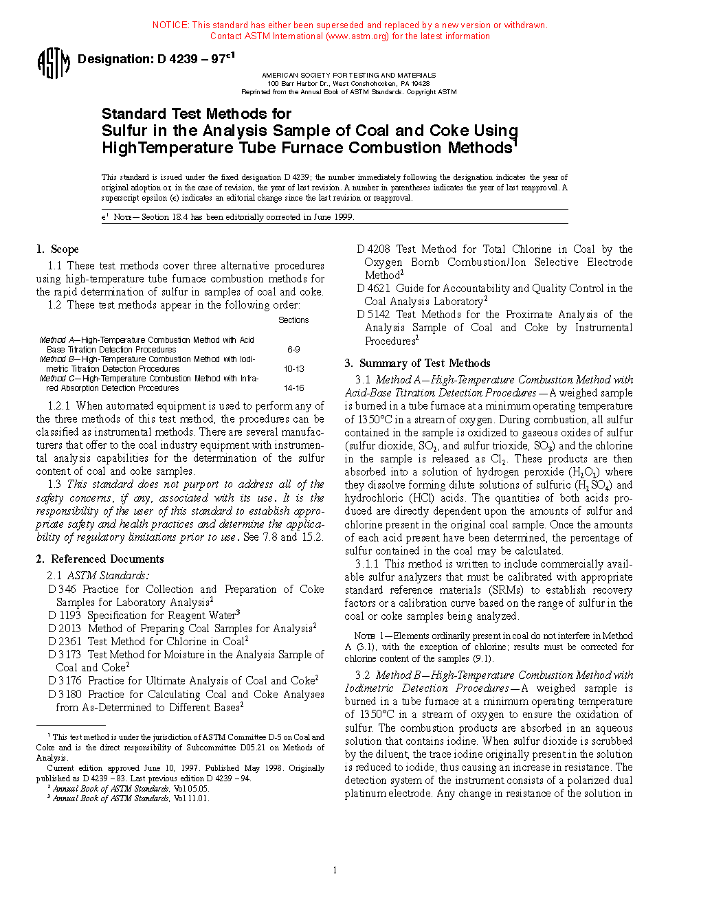 Sections Method A---High Temperature Combustion Method with Acid Base Titration Detection Procedures 6 to 9 Method B---High Temperature Combustion Method with Iodimetric Titration Detection Procedures 10 to 13 Method C---High Temperature Combustion Method with In- frared Absorption Detection Procedures 14 to 161.2.1 When automated equipment is used to perform any of the three methods of this test method, the procedures can be classified as instrumental methods. There are several manufacturers that offer to the coal industry equipment with instrumental analysis capabilities for the determination of the sulfur content of coal and coke samples.