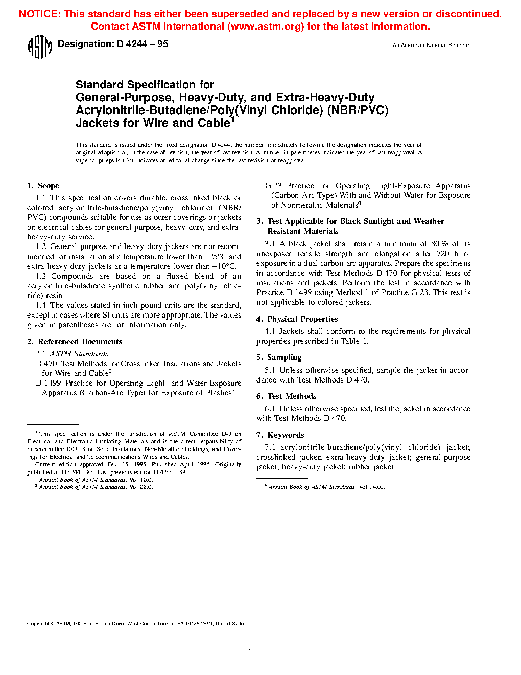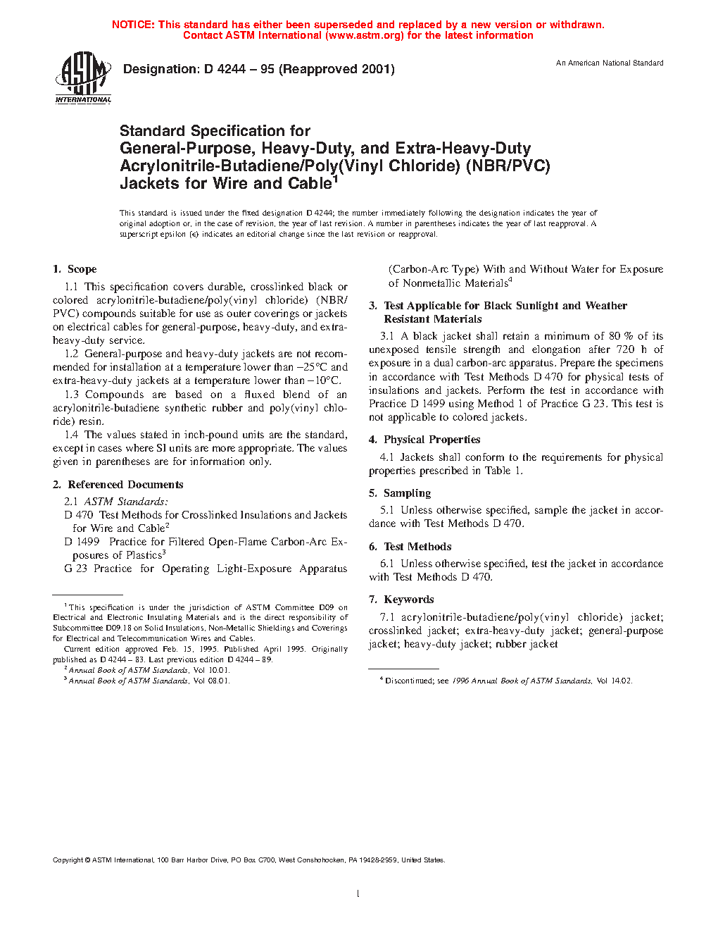 Standard Specification for General-Purpose, Heavy-Duty, and Extra-Heavy-Duty Acrylonitrile-Butadiene/Poly(Vinyl Chloride) (NBR/PVC) Jackets for Wire and Cable (Withdrawn 2007)