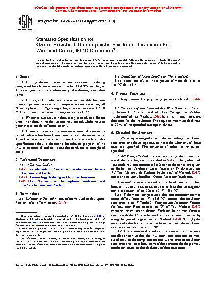 This specification covers an ozone-resistant thermoplastic elastomer insulation for electrical wire and cables. This type of insulation is considered to be suitable for continuous operation at the specified conductor temperatures and operating voltages in dry locations. The minimum installation temperature is specified. Tests shall be done on insulated wire or cable solely to determine the relevant property of the insulation material and not to test the conductor or completed cable. The insulation shall conform to the prescribed physical property requirements such as (1) tensile strength and elongation at rupture before and after air oven aging test, (2) heat distortion, and (3) thickness. AC voltage, insulation resistance, and DC voltage tests shall be performed in that order when any of these tests are specified for electrical requirements. The insulation shall not show any cracks when tested by cold bend test and shall show no cracking or surface checking after exposure to the prescribed ozone concentration.