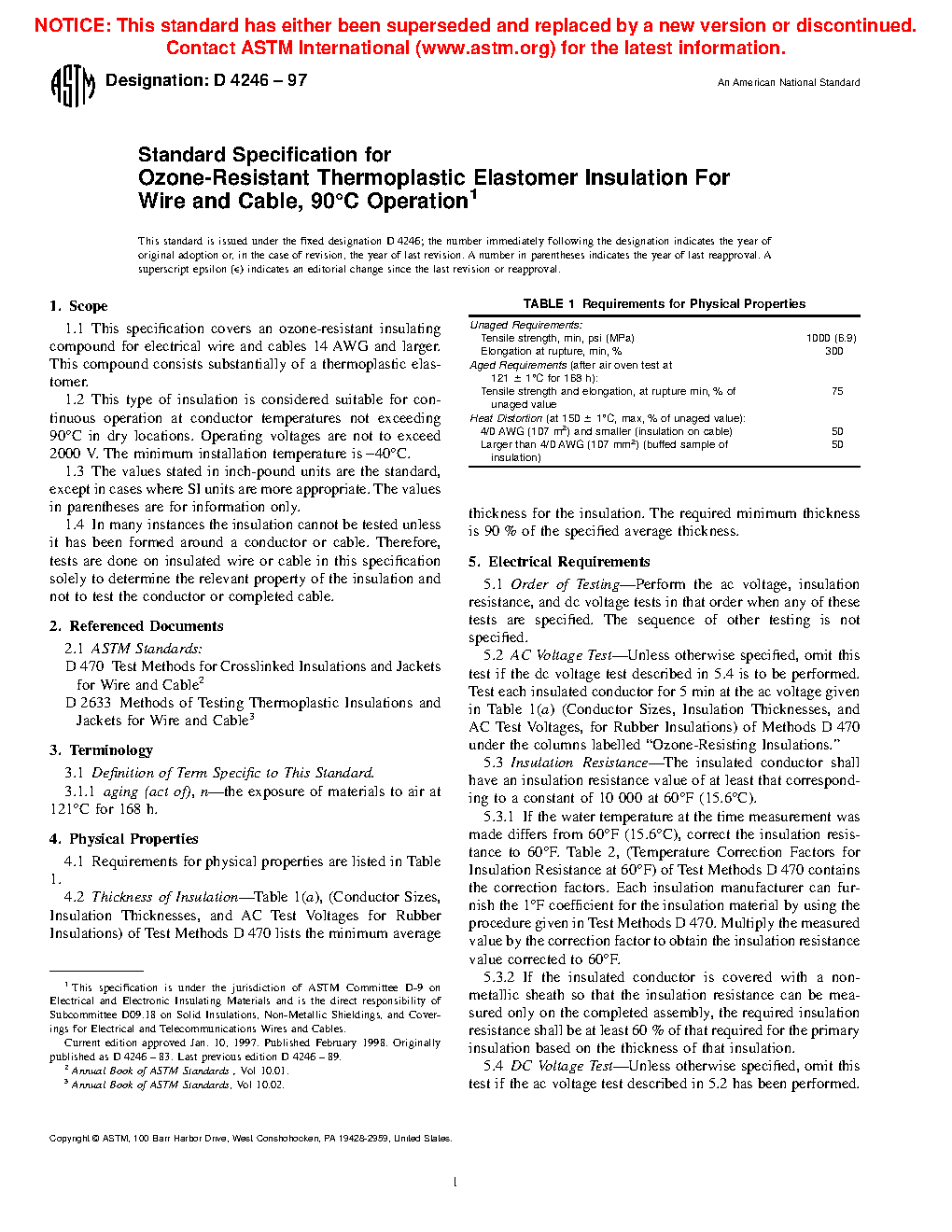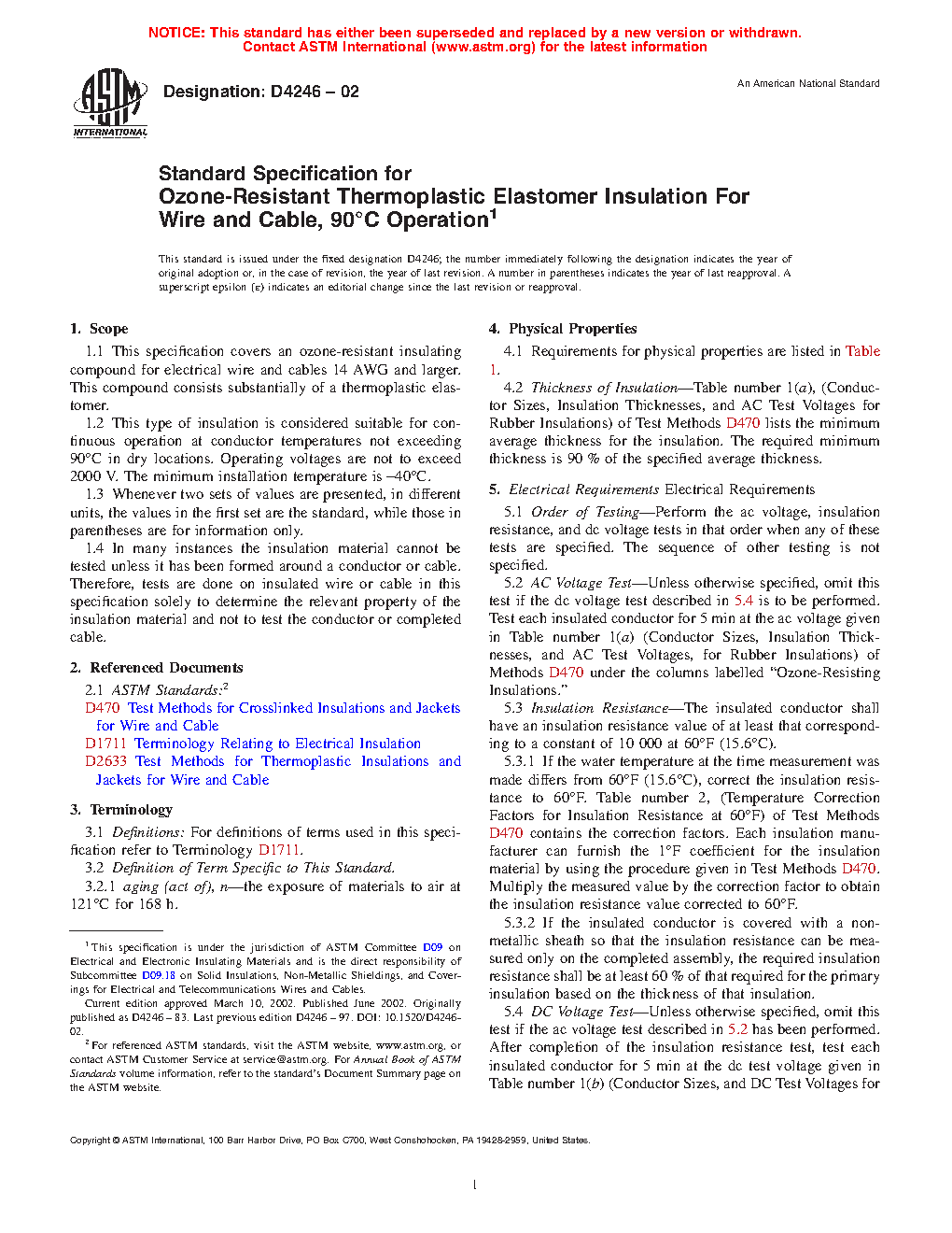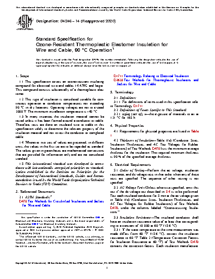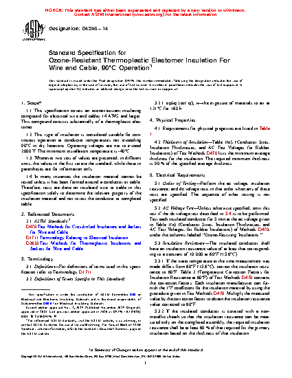 1.1 This specification covers an ozone-resistant insulating compound for electrical wire and cables 14 AWG and larger. This compound consists substantially of a thermoplastic elastomer.