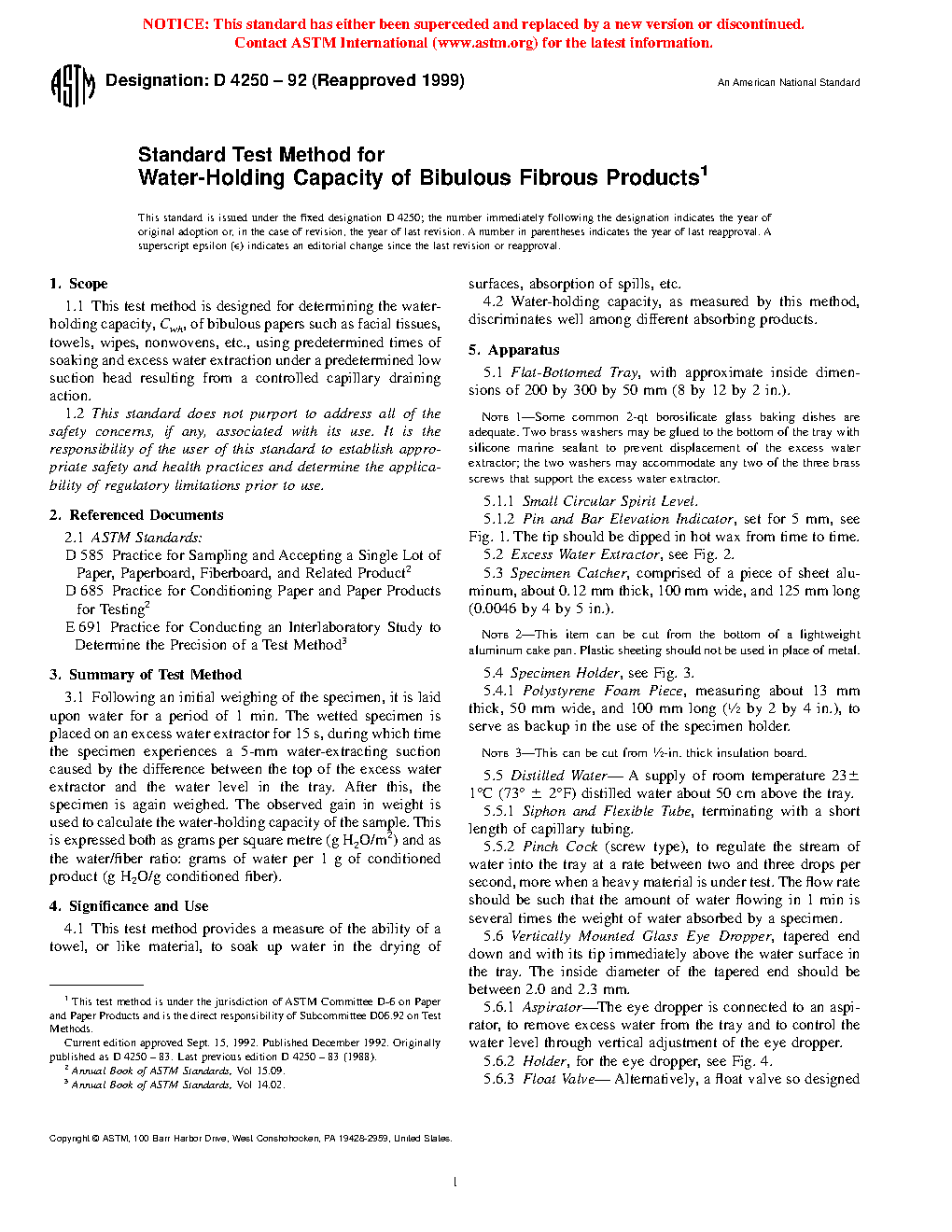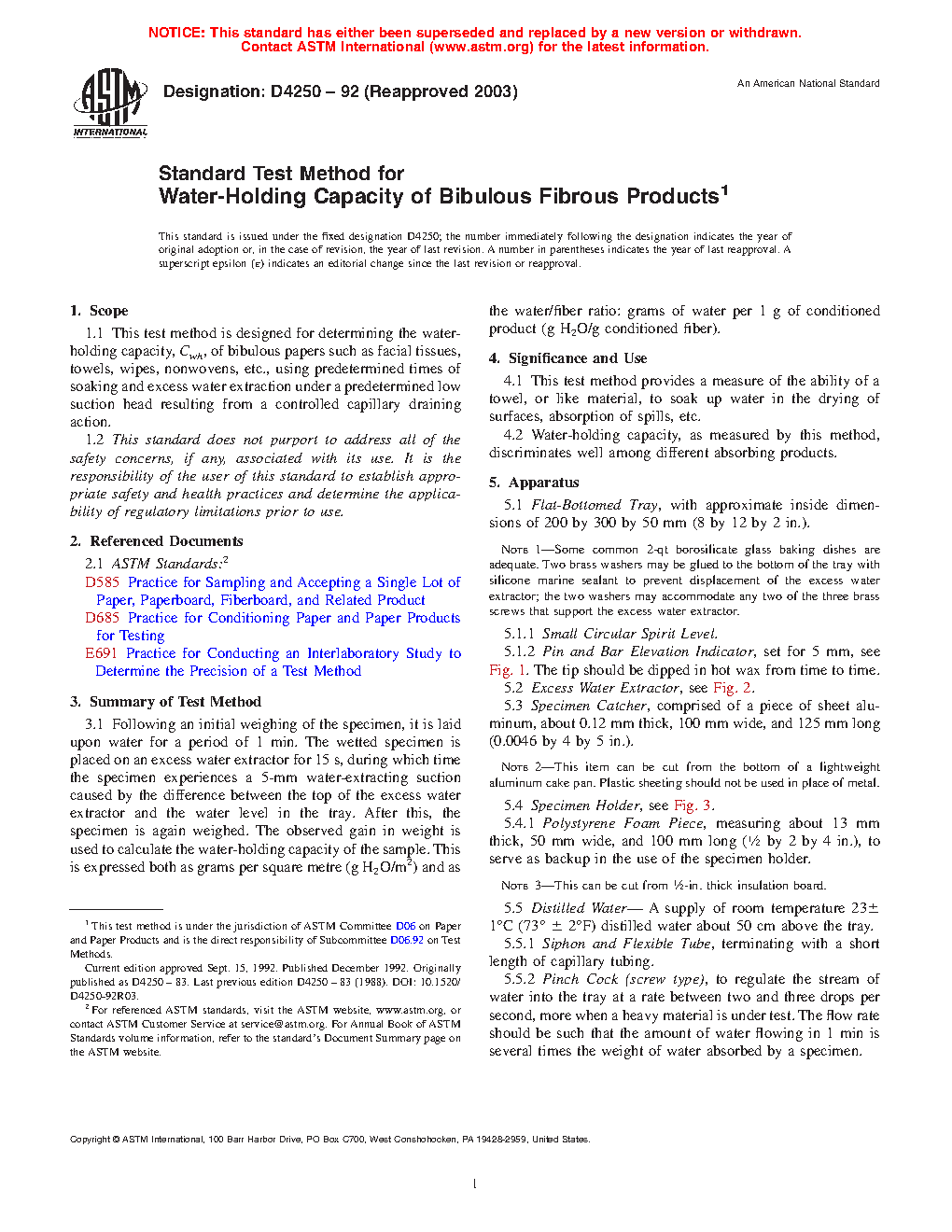 1.1 This test method is designed for determining the water-holding capacity, Cwh, of bibulous papers such as facial tissues, towels, wipes, nonwovens, etc., using predetermined times of soaking and excess water extraction under a predetermined low suction head resulting from a controlled capillary draining action.
