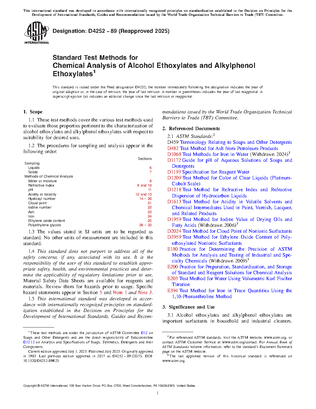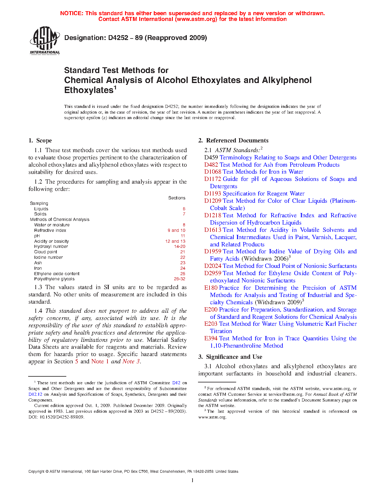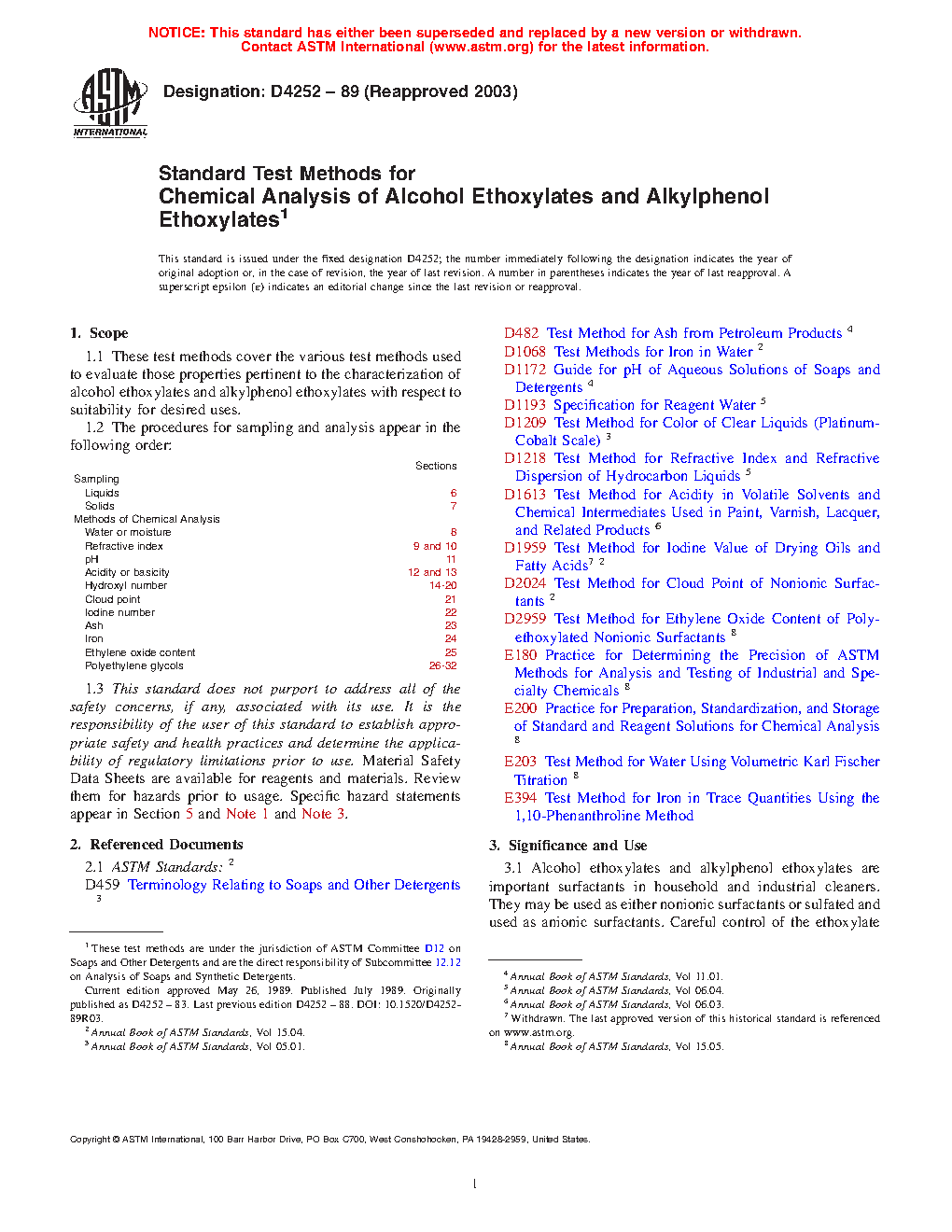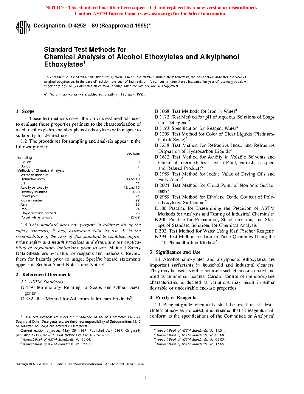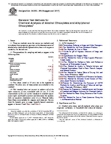 Sections Sampling Liquids 6 Solids 7 Methods of Chemical Analysis Water or moisture 8 Refractive index 9 and 10 pH 11 Acidity or basicity 12 and 13 Hydroxyl number 14 to 20 Cloud point 21 Iodine number 22 Ash 23 Iron 24 Ethylene oxide content 25 Polyethylene glycols 26 to 321.3 This standard does not purport to address all of the safety concerns, if any, associated with its use. It is the responsibility of the user of this standard to establish appropriate safety and health practices and determine the applicability of regulatory limitations prior to use. Material Safety Data Sheets are available for reagents and materials. Review them for hazards prior to usage. Specific hazard statements appear in Section 5 and Notes 1 and 3.
