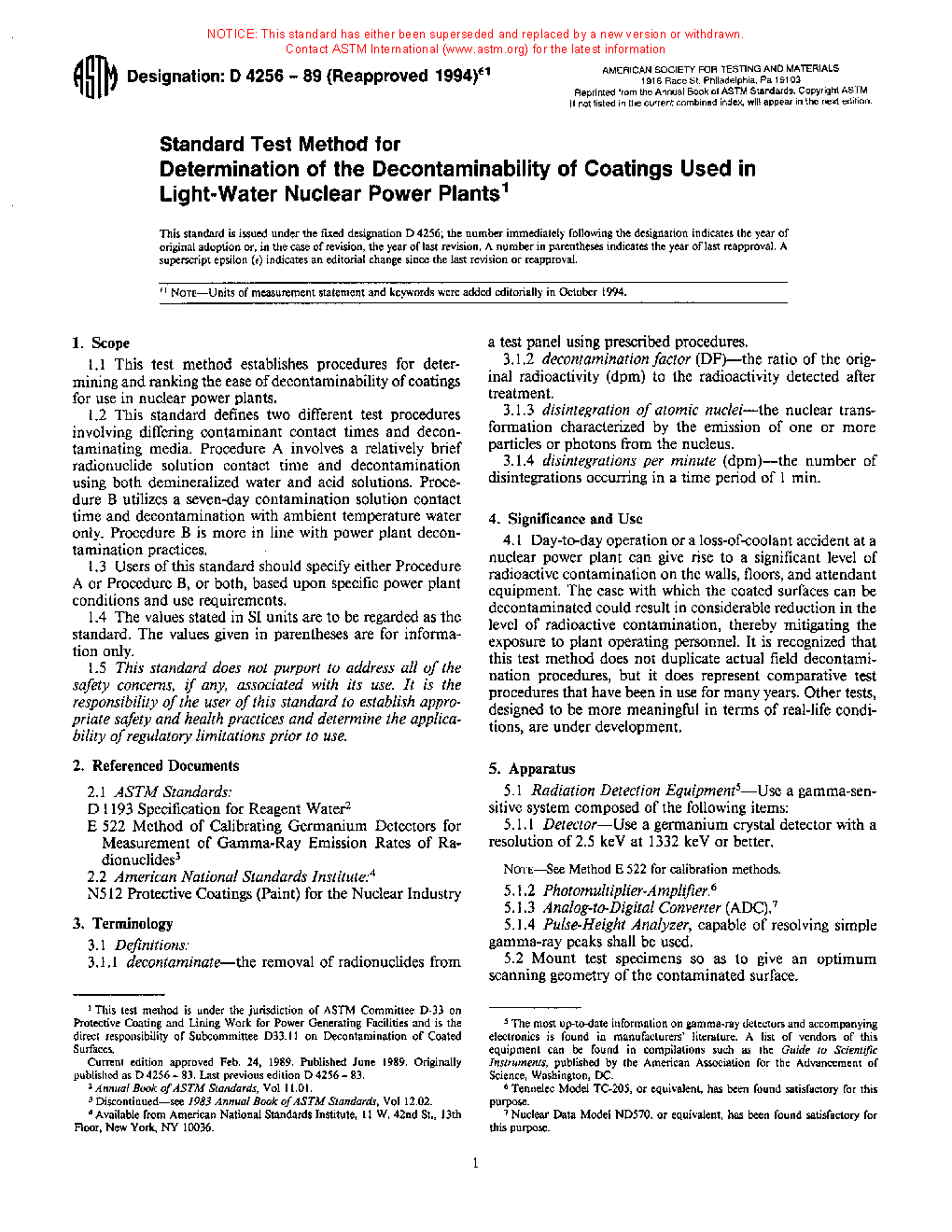 Test Method for Determination of the Decontaminability of Coatins Used in Light-Water Nuclear Power Plants (Withdrawn 1995)